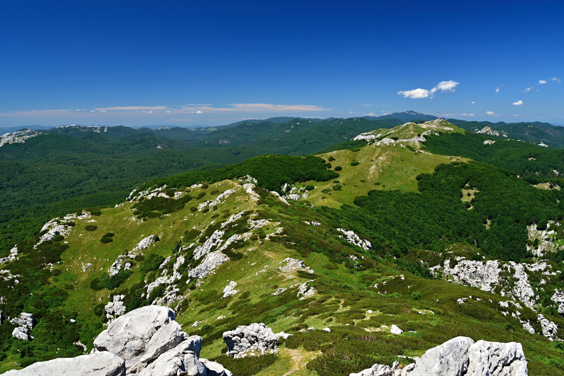 Výhled je opravdu krásný a nebýt letního oparu, přímo dokonalý. Na východě vystupuje skála Velikeho Risnjaku, na který půjdeme další den. Za ním se táhnou kopce Velike Kapely a v dálce vystupuje majestátný Velebit. Na severu se rýsují slovinská pohoří – Kamniško-Savinjské Alpy a Karavanky. Na severozápadě jasně vystupuje kužel slovinského Velikeho Snežniku a blíže sestra chorvatského Snježniku - Guslica, bývalá vojenská základna. Jihozápadním směrem je vidět výrazný istrijský Vojak. No a na jihu samozřejmě Jaderské moře a ostrovy Kvarnerského zálivu.