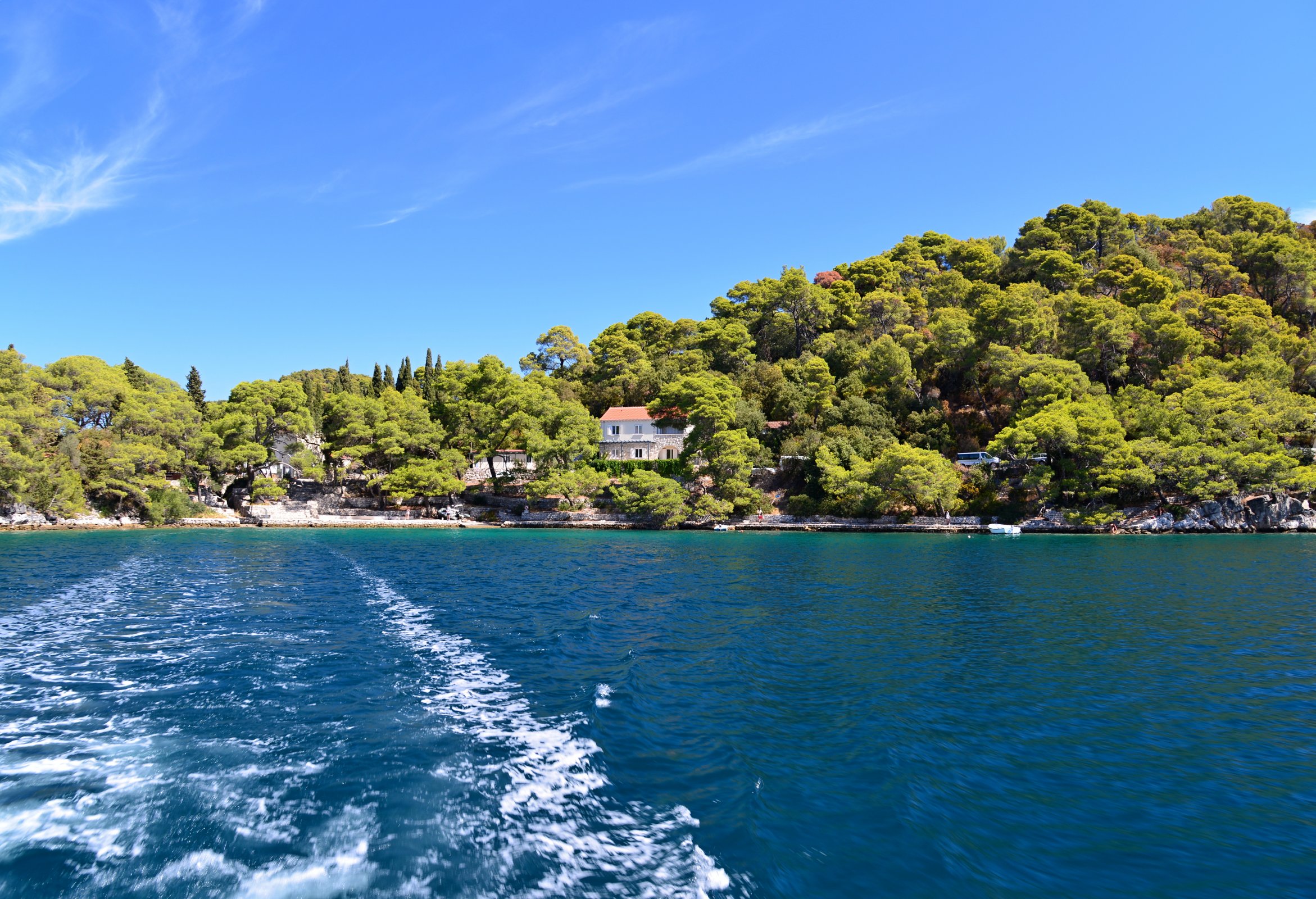 Chorvatsko - ostrov Mljet: Veliko jezero - pohled z ostrůvku sv. Marije na vyhlídku Montokuc
