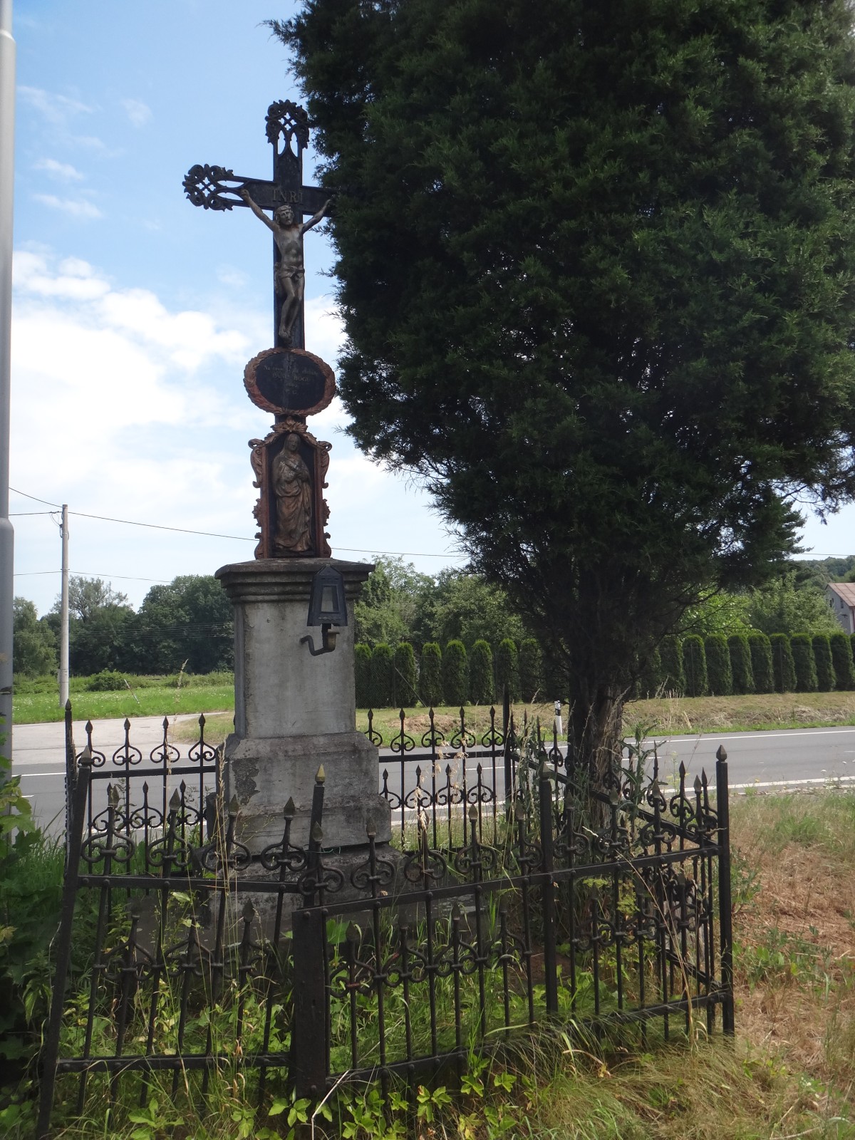 Šlapu si to, ani nevím jak a mezi poli se ocitám u česko-polského propojovacího plynovodu spolufinancovaněho z prostředků EU. Kolem statku s koni pokračuji k hasičské zbrojnici a ke hřbitovům a kostelíku, se zastávkou u dvou památných lip. Na hřbitově s kostelem se opravují cestičky, takže se tam člověk trochu obtížně pohybuje. Před kostelem je kamenný kříž z r. 1925. Protože má cesta vede po asfalce a je úmorné vedro, rozhoduji se, že stopnu auto, které by mě svezlo alespoň kousek k zámku. A mám štěstí, zastavuje mě paní, která si sice zajíždí, ale ochotně mě zaveze až k zámku a také se dovídám nějaké informace. Následuje prohlídka hlásky a "zámku" (o tom v samostatném příspěvku).