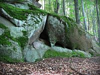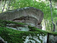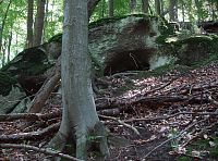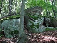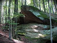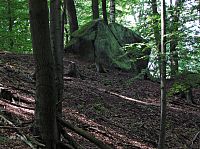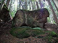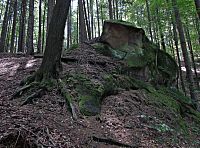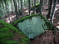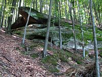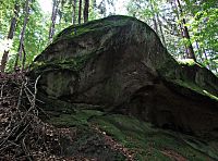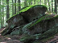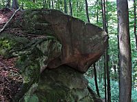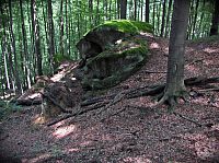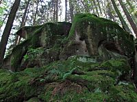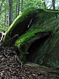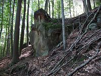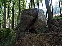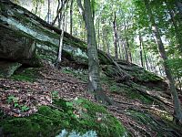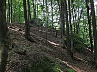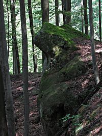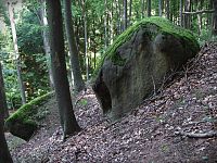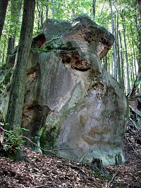 Od ní jsem pak směrem k západu míjel další bizarní výchozky i větší skaliska, k jejimž úpatím vedly jen nezřetelné pěšinky připomínající stezky zvěře... a od nich zase stoupal svahem (anebo pro změnu klesal) dál a dál, kterážto moje trasa převedená do grafu by nejspíš navozovala představu procházky po hřbetu lochnesské příšery. Nakonec nožky doškobrtaly k mohutnému skalnímu bloku, který mi byl povědomý již z minula. Teprve tady jsem si udělal představu o rozlehlosti přerušovaného skalního pásu „Pochcané skaly“, který dosahuje délky nejméně půl kilometru!