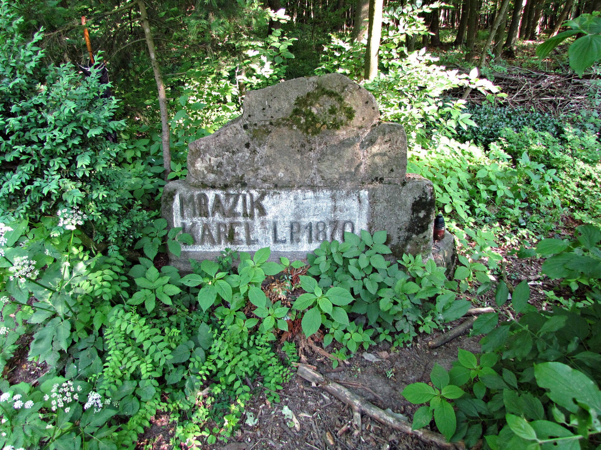 U stromu, na němž jsou umístěny turistické směrovky, leží na okraji lesa pískovcový balvan s nápisem. Jedná se o prostý pomníček lesního adjunkta Karla Mrázka, kterého v těchto místech zavraždili roku 1870 pytláci. Pro odstranění nepohodlného svědka prý zvolili obzvláště bestiální způsob: svázaného adjunkta pověsili na strom za nohy, aby jeho hlava visela těsně nad mraveništěm!