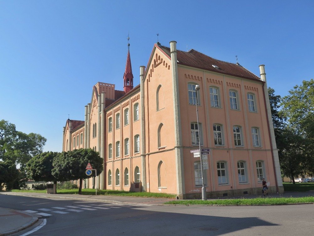 V každém případě je monumentální růžová školní budova, kterou najdeme na adrese Školní náměstí č.p. 6, zajímavým neogotikým objektem, který byl postaven v letech 1863 až 1864 podle projektu významného architekta a známého regotizátora Františka Schmoranze st. Vznikla tak reprezentativní dvoupatrová budova palácového typu o 13 osách, kterou člení rizality, římsy i lisény s polosloupy. Mezi zdobné prvky na fasádě patří obloučkové vlysy a štukový čtyřlist.