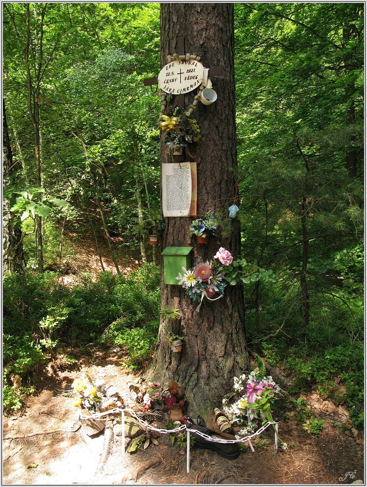 Kvalitně udržované pietní místo všech Cimrmanologů u rozcestí Pod Husou. Proč vzniklo si přečtěte na přiložené fotografii. Pár desítek metrů odtud po zelené značce směrem na Vlhošťský důl je ve skále ještě Cimrmanův léčivý pramen. Sice z něho nic neteče, ale zkuste otočit kohoutkem. Co kdyby...