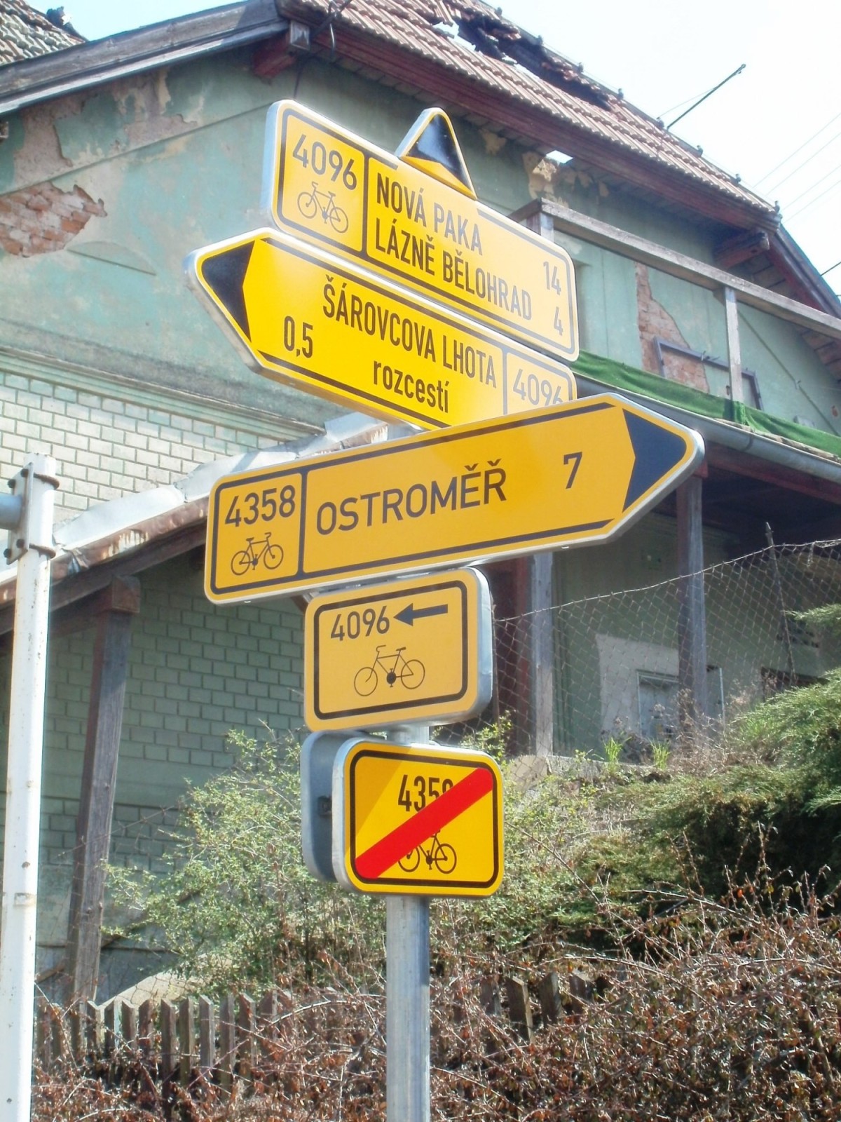 Cykloturistický rozcestník, který se nachází u pomníku obětem válek v Šárovcově Lhotě, ukazuje cyklistům cestu do dvou směrů. Po cyklotrase KČT č. 4096 ve směru Šárovcova Lhota - Lázně Bělohrad, Nová Paka a po cyklotrase KČT č. 4358 ve směru Šárovcova Lhota - Ostroměř.