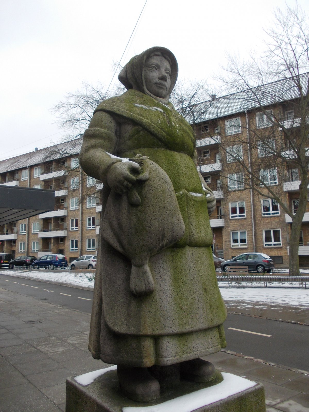 Sochu ženy - predavačky rýb odhalili v novembri 1940, jej autorom je sochár Christian Svejstrup Madsen (1883 - 1946). Postava ženy je obetá v zimnom oblečení, v kabáte až po zem, na hlave má šatku, v pravej ruke drží veľkú rybu. Socha bola darom od sochára pre Nadáciu a podporu umeleckých cieľov. Umiestnili ju na mieste, kde ženy rybárov celoročne za všetkých poveternostných podmienok predávali ryby, ktoré ulovili ich manželia. Sochu odhalili na Gammel Strandu, kde každý deň malé rybárske člny privážali svoj úlovok, išlo prevážne o slede. Tento rybí trh tu fungoval až do roku 1958, v zime i v lete, rybárske ženy vyvolávali hlasito k nákupu rýb. Po roku 1958 sa rybí trh presťahoval do Sydhavnenu, na miesto, kde dnes stojí nákupné centrom Fisketorvet.