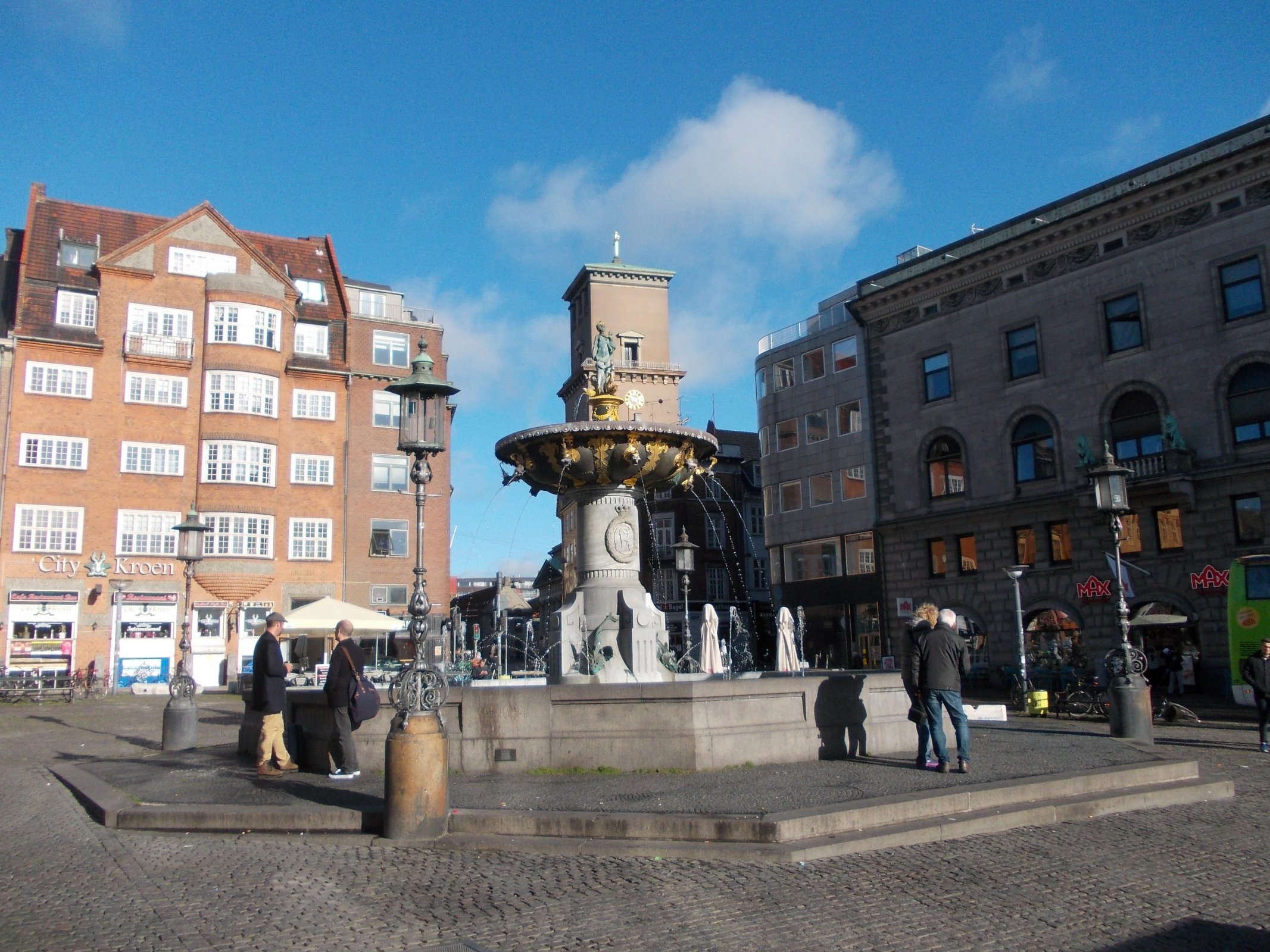 Táto nádherna fontána Caritas z roku 1609, prvá v Dánsku je považovaná za jednu z najkrajších pamiatok Kodane obdobia renesancie. Bola darom mesta od vtedajšieho kraľa Christiana IV., ktorý v rokoch 1588 - 1648 vládol Dánsku a Nórsku. Je skutočne pôsobivá, jej pozlatené dekorácie sú nádherné. Fontána bola aj súčasťou mestkého zásobovania vodou, nachádala sa pod ňou veĺká zásobarňa vody, ktorú privádzali z jazera Emdrup potrubím vyrobeným z kmeňov stromov s vyškovým rodielom 9 metrov, ktorý tak zabepečil dostaočný tlak vody pre fonánu. Voda bola samorejme aj pre obyvateľov, mohli si ňou naplniť vedrá a sudy. A prečo názov fontány Caritas? Caritas je bohyňou veľkorysosti, milosrdensva na fontáne je znázornená pri kojení dieťaťa. Fontánu tvorí na kamennom stĺpe bronzová socha tehotnej bohyne s jedným dieťatom v náručí, pravou rukou hladí vo vlasoch ďalšie dieťa. Z hornej misky, bohato zlatom zdobenej voda steká do dolného kamenného bazéna. Voda do dolného bazéna vyteká aj z troch chrličov v podobe rýb.
