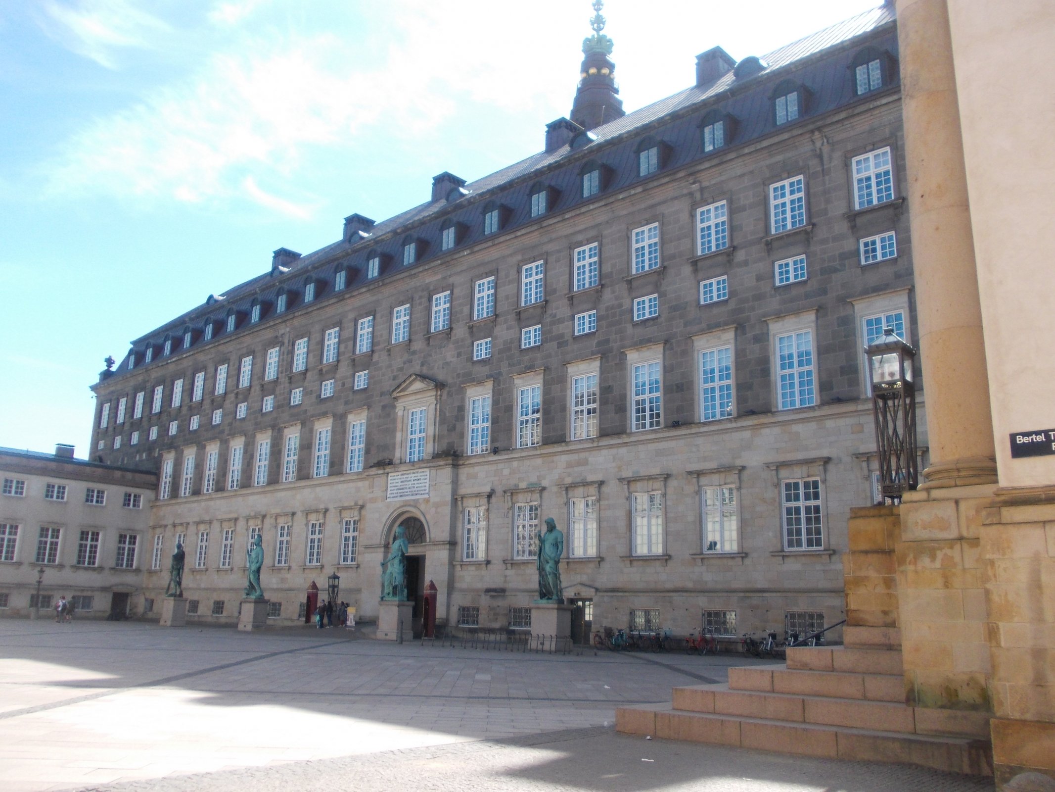 Z nádvoria sa vstupuje do budov kráľovských kancelárii, najvyššieho súdu a do kancelárie predsedu vlády. Nádvorie zdobia štyri bronzové sochy postáv z gréckej mytológie. Sú to sochy Minerva, Askulap, Nemesis a Hercules. Sochy som si pozrel podrobnejšie a niečo som sa o nich aj dozvedel. Minerva je dcéra Jupitrera a Metis, v rímskej mytológii je bohyňou múdrosti, poézie, medicíny, obchodu, tkania, výšiviek. Väčšinou je znázorňovaná so symbolmi v ľavej ruke s vetvičkou olivovníka, v pravej ruke s kópiou, u ľavej hohy jej sedí sova, symbol múdrosti. Askulap - jeho symbolom je had obkrútený okolo palice. Nemesis je v gréckej mytológii bohyňou spravodlivosti a pomsty. Hercules, syn Dia a Alkmény, bol v gréckej mytológii božským hrdinom, ktorý neustále bojoval proti príšerám, zvieratám a všetkému druhu zla. Sochy sú diela známych dánskych umelcov Bertela Thorvaldsena a Hermana Wilhelma Bissena. Hercules je dielom sochára Thorvaldsena, ostatné tri sochy zhotovil sochár Bissen.
