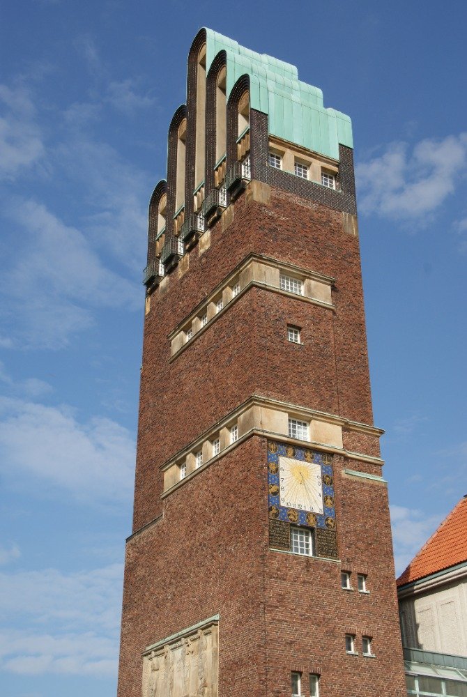 Vstupní hale dominují dvě mozaiky Friedricha Wilhelma Kleukense s názvy Polibek a Věrnost. Její strop má podobu noční oblohy a najdeme zde také „nástupiště“ výtahu, který sem byl ovšem nainstalován až později. Tělo věže je postaveno z temně červených pálených cihel a v jeho spodní části najdeme pískovcový reliéf Heinricha Jobsta se zpodobněním čtyř Ctností (Síla, Moudrost, Spravedlnost a Tolerance). Na jižní straně věže jsou od roku 1914 umístěny sluneční hodiny, jejichž podobu s 12 znameními zvěrokruhu navrhl již zmíněný F.W. Kleukens. A také si zde můžeme přečíst dvě sloky básně R.G. Bindinga.