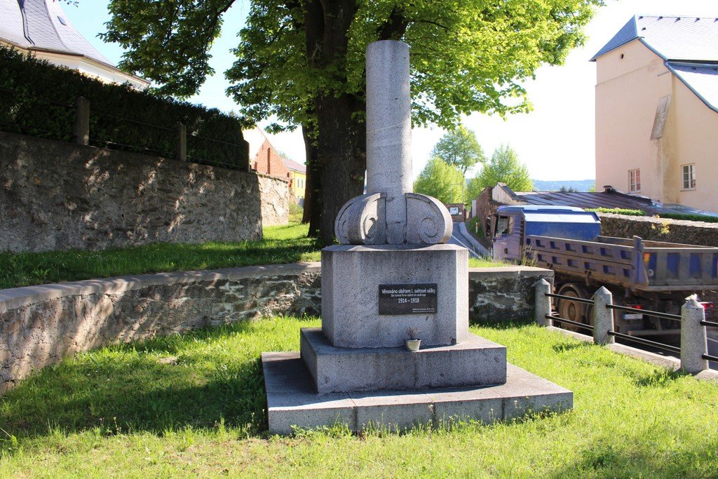 Pomník je umístěn na náměstí pod kostelní zdí. Stojí uprostřed travnaté plochy, kolem které je kamenná zídka. Na straně k náměstí je zábradlí nad opěrnou zdí. Pomník je zhotoven ze žuly a má několik stupňů. Základem je žulová deska, na které je menší deska a nad ní podstavec s černou deskou z leštěné žuly. Na desce je nápis „Věnováno obětem 1. světové války 1914 – 1918“. Pod českým textem je německý překlad. Na desce vpravo dole je další nápis „ Občané městyse Dešenice“ opět s německým překladem. Nad podstavcem je sloup ve tvaru válce a u jeho paty jsou zdobné prvky připomínající spirálu. Pomník připomíná 25 obětí války. Ve zdi pod pomníkem roste tis, což je skutečně rarita.