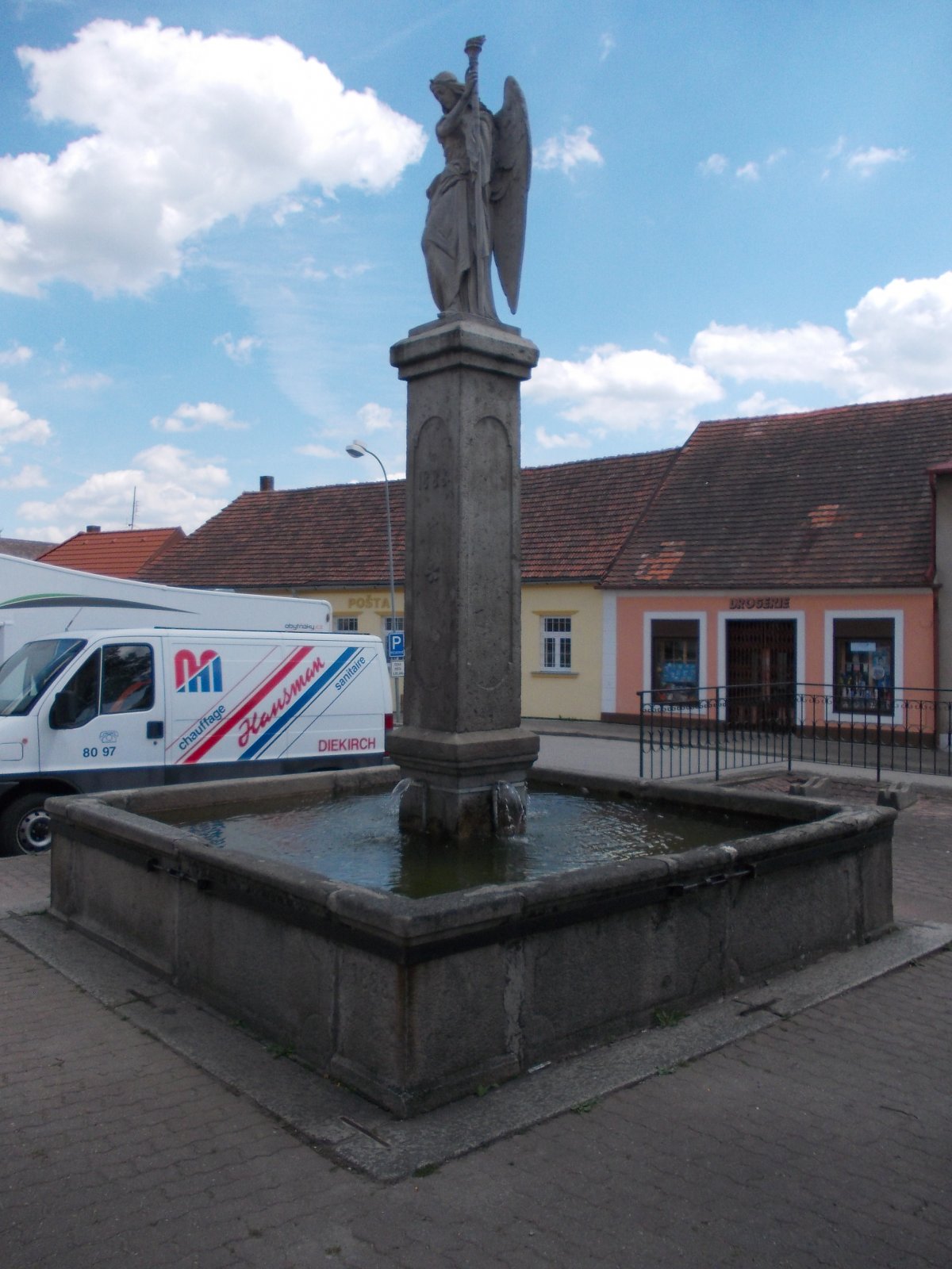 Ďalšou historickou pamiatkou je kamenná baroková kašna z roku 1888. Dolnú časť tvorí kamenný bazén v pôdoryse tvaru štvorca, ktorý je vo svojej hornej časti zviazaný kovovým pásom. V strede bazéna je hranolovitý stĺp, ktorý má v dolnej časti umiestnené štyri chrliče vody. Na stĺpe je socha anjela, pod ktorou je letopočet 1888.