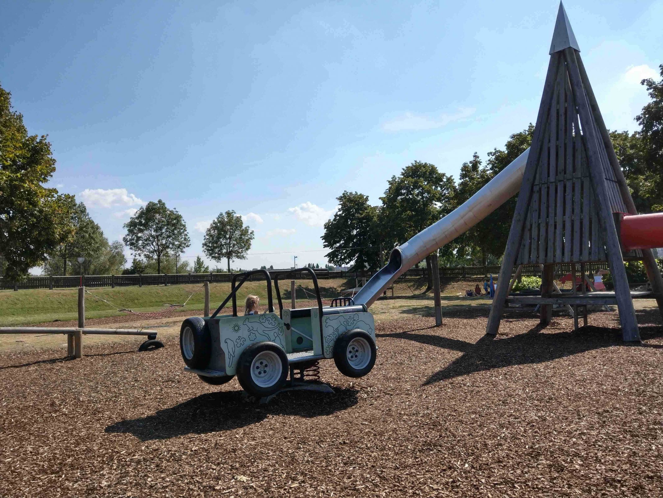 Na ostrove Doanuinsel narazíte na viacero detských ihrísk, no najkrajšie sa nachádza hneď vedľa vodného ihriska neďaleko mosta Kaisermuhlenbrucke určeného pre chodcov a cyklistov. Ihrisku dominuje obria drevená pyramída so šmykľavkou (je krytá, takže v lete nepáli). V tieni nájdete vodnú pumpu s kaskádou drevených žľabov. Zaujme aj lanovka a pružinové hojdacie autíčko.