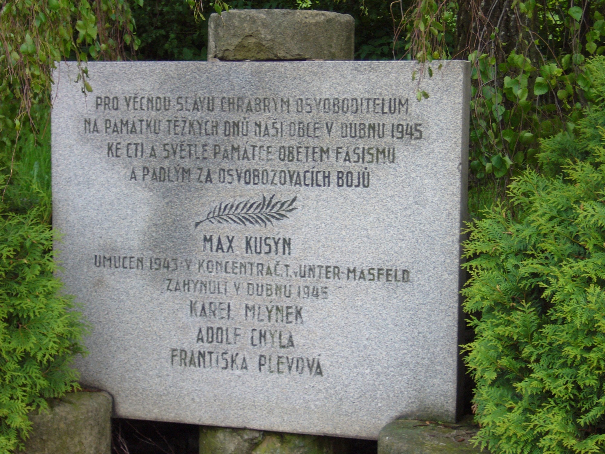Druhý, pomník obětem druhé sv. války, je prostá deska s nápisem, téměř se ztrácející v zeleni. Poněkud nepietně působí fakt, že naň téměř navazuje prostor autobusové zastávky...