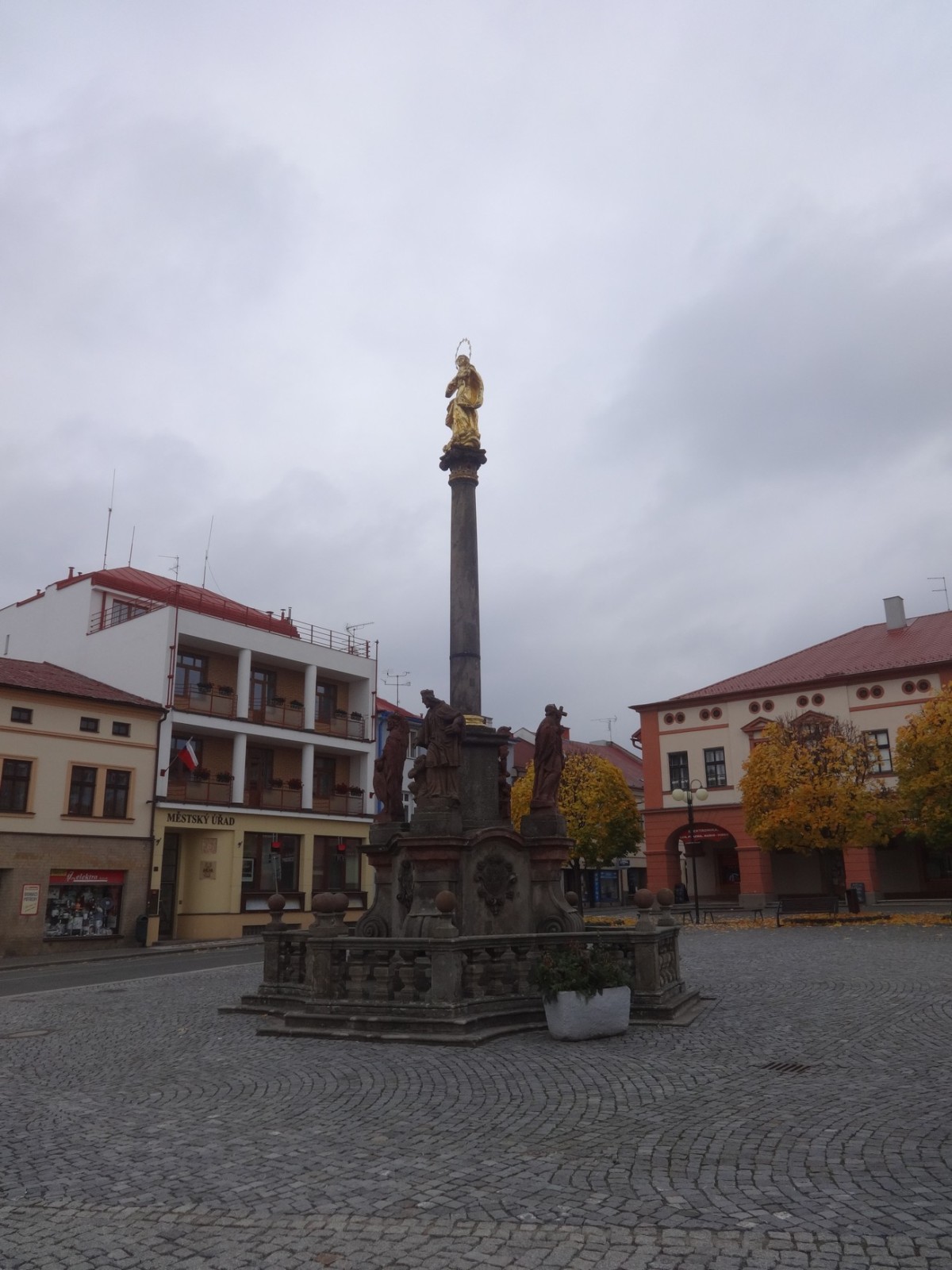 Vysoký sloup s Pannou Marií je obklopený čtyřmi sochami svatých. Jsou na něm postavy sv. Václava, sv. Jana Nepomuckého, sv. Františka Xaverského a sv. Floriána.