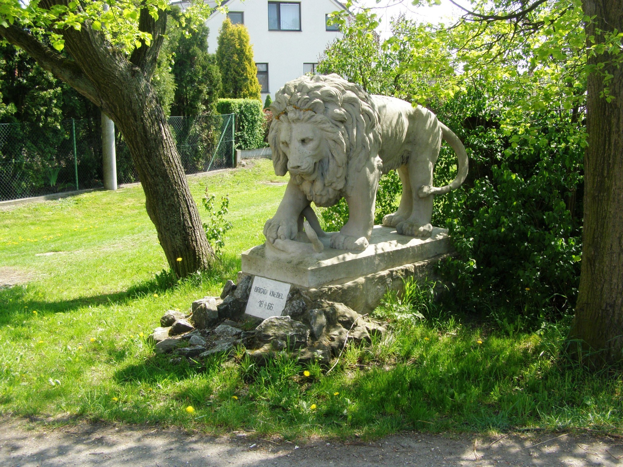 Pomník rakouské Knebelovy brigády od X. armádního sboru - jedná se o plastiku stojícího lva s mohutnou hřívou drtícího pravou nohou hada. Socha pochází z Itálie a byla darována rakouským ministerstvem války Ústřednímu spolku. Pomník, který je vytesán z mušlového vápence byl zhotoven rakouskými sochaři, kteří sloužili jako vojáci v Itálii. Socha instalována někdy kolem r. 1901. Další dva téměř identické pomníky lva se nacházejí u Ossaria na Chlumu.