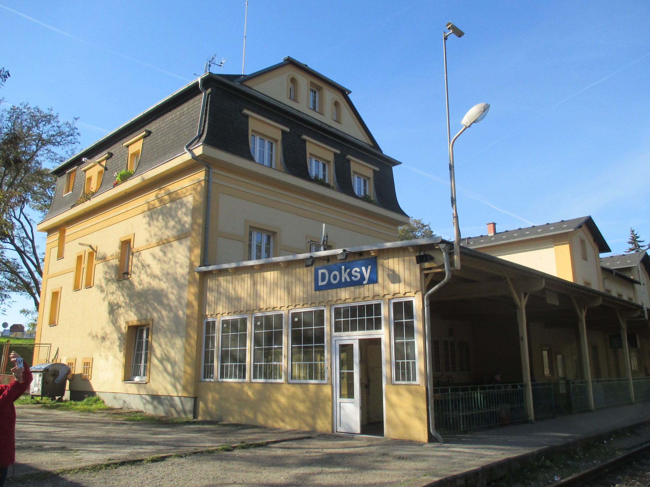 Železniční stanice Doksy leží na severním okraji tohoto města, kousek od Máchova jezera, v nadmořské výšce 270 metrů. Jezdí tudy vlaky po železniční trati č. 80 směr Česká Lípa, Jedlová, Bakov nad Jizerou, ale v sezóně také do Liberce či Prahy.