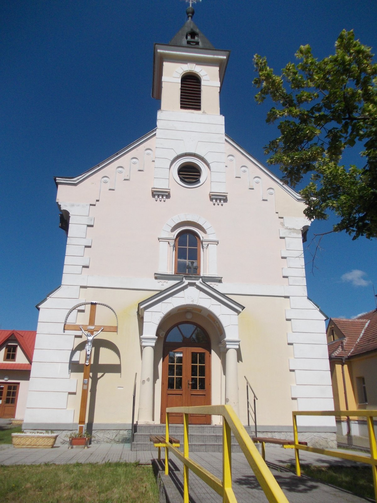 Vľavo pri vstupe do kostola je umiestnený drevený kríž s dvoma malými pamätnými kovovými tabuľkami. Na prvej sa udáva ,,Pamiatke z primícií misioára Fr. Gálisa 1968,,. Druhá tabuľka píše, že kríž bol obnovený pri posvätení rozšíreného kostola 1. 8. 2004.