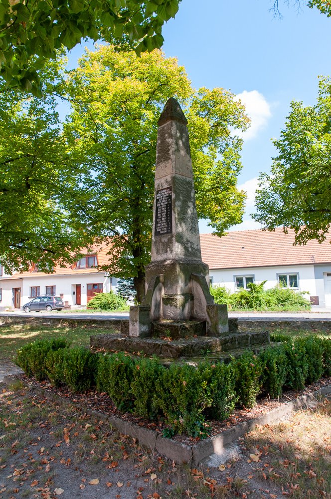 Pomník padlých 1. světové války doplněný po 2. světové válce o další jména nemůže chybět v celkem velké obci poblíž Blanska. Hlavní část pomníku tvoří vzhůru se zužující pískovcový monolit v podobě obelisku, zakončeným jehlancovitým vrcholem. Pomník je posazen na čtvercovém odstupňovaném základu, spodní část doplňují podpěry v podobě nízkých kamenných žeber.