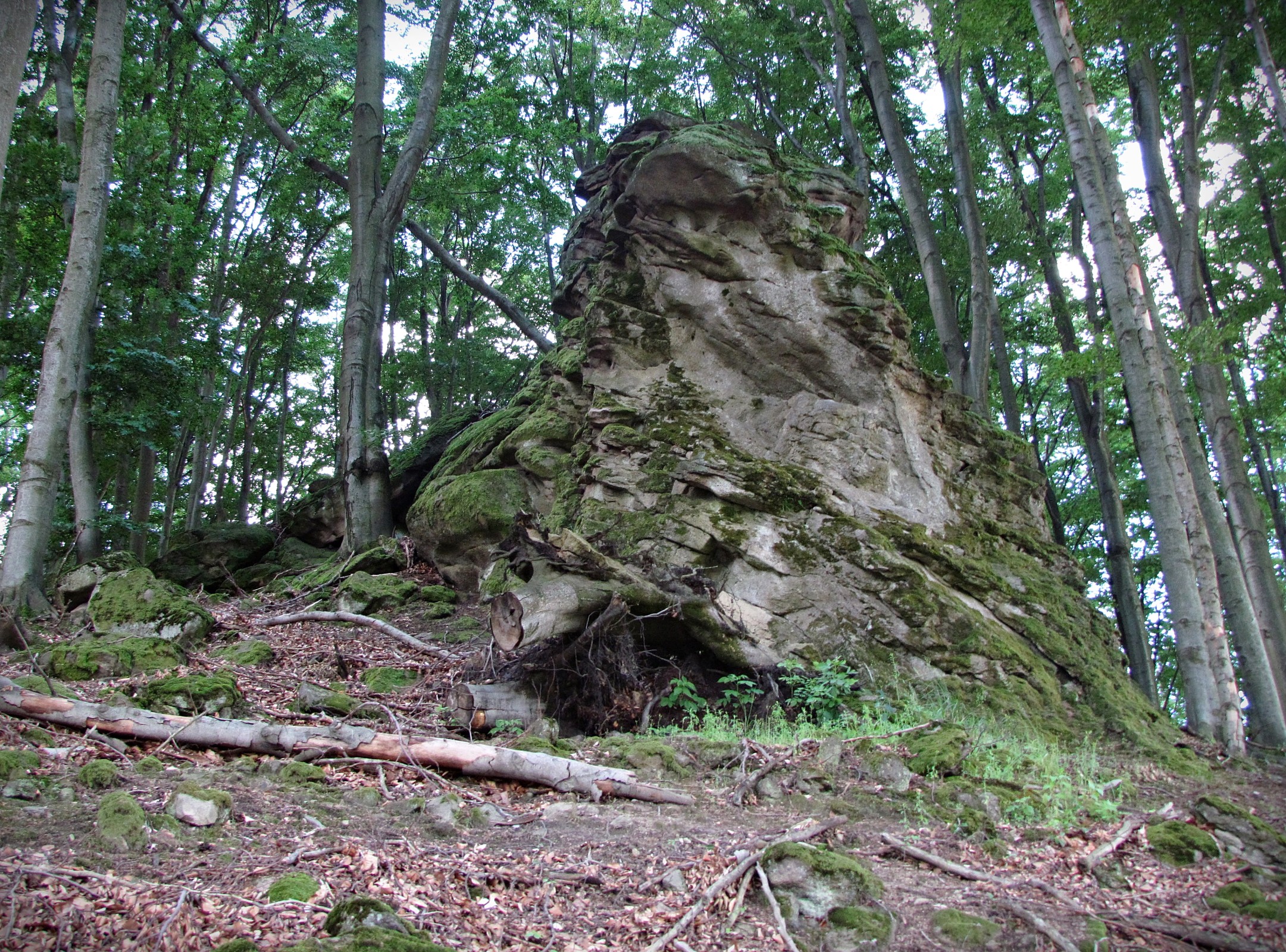 Vraťme se ale k mému hlavnímu cílu cesty na kopec. Cestou po silničce okolo Bradného potoka jsem na vrcholu Zámčiska mezi kmeny stromů zahlédl jakýsi podezřelý stín. Ne nebyl to ten drak z pověsti, kterou jsem si beztak vymyslel, ale po vyfocení zoomem se mi na displeji zobrazil obrázek většího skaliska. I když jsem měl za sebou průstup skalní oblastí klenovských Jazévek a Komína, přec jen jsem neodolal a – horko nehorko – zamířil k vrcholu. Tady už ve stínu dosud nevykácené bučiny jsem narazil na pískovcové a slepencové skalisko, které by se dalo zařadit do kolonky mrazový srub.