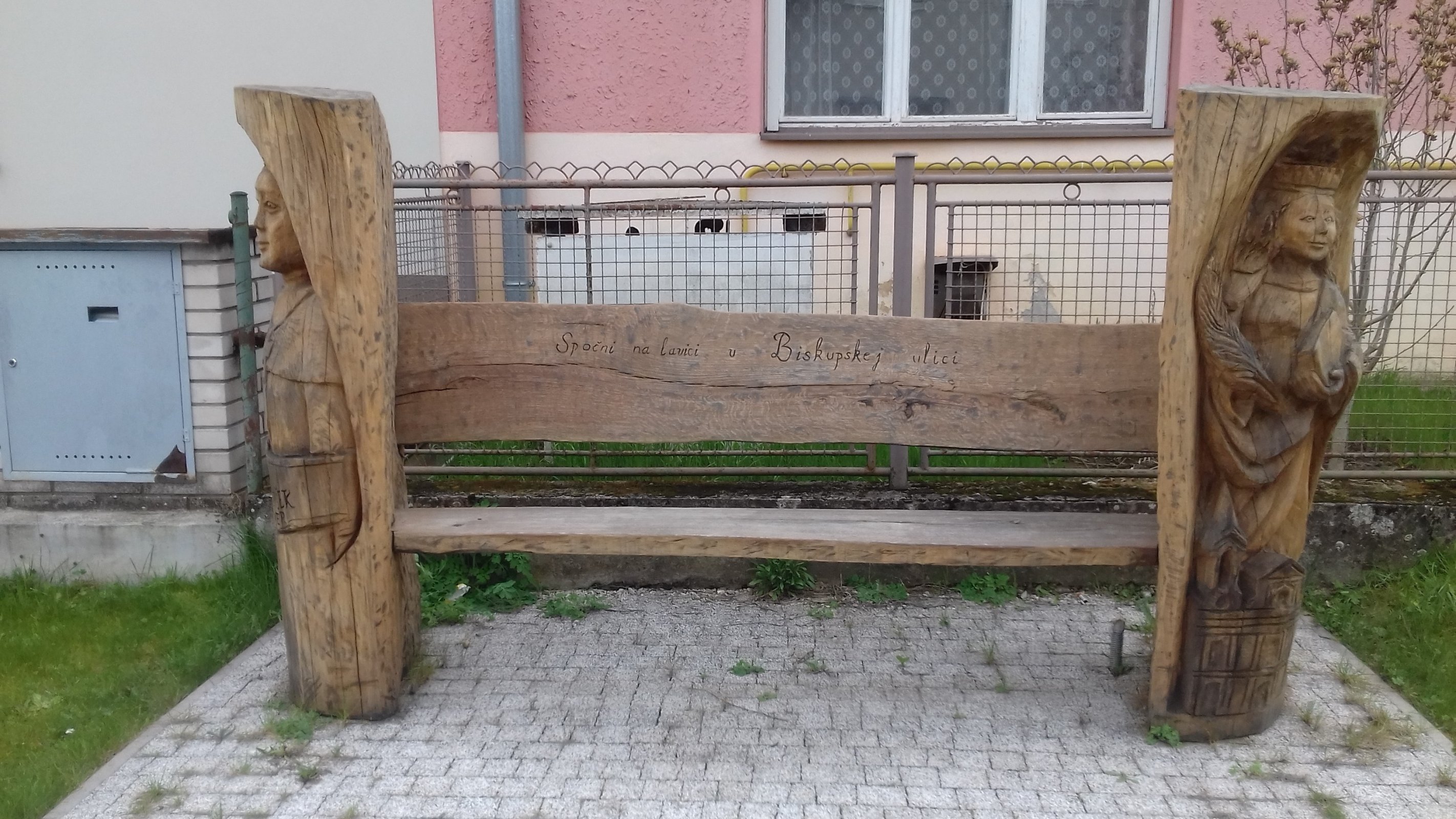 Prvou lavicou bola Biskupská lavica. Z jednej strany bola vyrezaná z dreva postava muža a predstavovala nitrianskeho biskupa Františka Xavera Fuchsa, ktorý sa veľkou mierou pričinil o rozvoj obce. Na druhej strane lavičky je socha podľa mňa dievčaťa s knihou a kostol. Lavička nás lákala posedieť si na nej vyrytou vetou : "Spočni na lavici v Biskupskej ulici", tak som na chviľku "spočla".