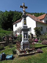 O něco dál se naproti nad potokem z břehu vypíná kamenný kříž z roku 1873. Nedávno byl vzorně renovován a přitom velmi působivě barevně upraven. Sestává ze čtvercového soklu, z něhož vystupuje vysoký hranolový podstavec rozčleněný římsami na dvě části. Ve spodní je umístěn trošíčku naivní reliéf Panny Marie stojící na „obláčcích“ z kamene, v horní uvidíme reliéf pozlaceného kalicha. V nejhořejší části nad římsou vystupuje krucifix s ukřižovaným Ježíšem Kristem.