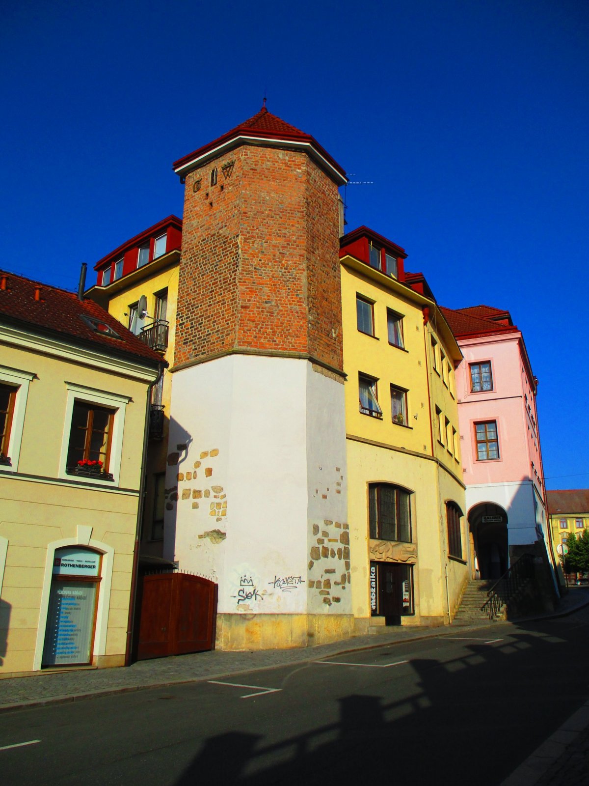 Původní zástavba, která přímo sousedila s v roce 1873 zbouranou Mýtskou (Slezskou) bránou, tu stála již v období gotiky, aby byla během 2. poloviny 16. století přestavěna do renesanční podoby. Později prošla ještě řadou úprav a přestaveb, zejména počátkem 19. století, kdy získala klasicistní fasádu, aby pak v 50. letech 20. století tak zchátrala, že hrozila její demolice. K té nakonec de facto došlo a na místě středověkého objektu vznikla v letech 1964-1972 novostavba, která má v severovýchodním nároží zachovaný zbytek gotické hranolové věže z roku 1476, což je pozůstatek zdejšího trojitého opevnění, přičemž každé z nich bylo u brány opatřeno věží, vnitřní dokonce 2 věžemi a bránou. Všechny věže však byly postupně zbourány, první byla spálena císařským vojskem v roce 1640, kdy obléhalo Švédy, druhá věž zanikla roku 1787, třetí věž v roce 1778 (nejprve však byl odstraněn její vrch, střecha a nejvyšší poschodí), resp. při bourání brány roku 1873 (s částí věže z roku 1476).