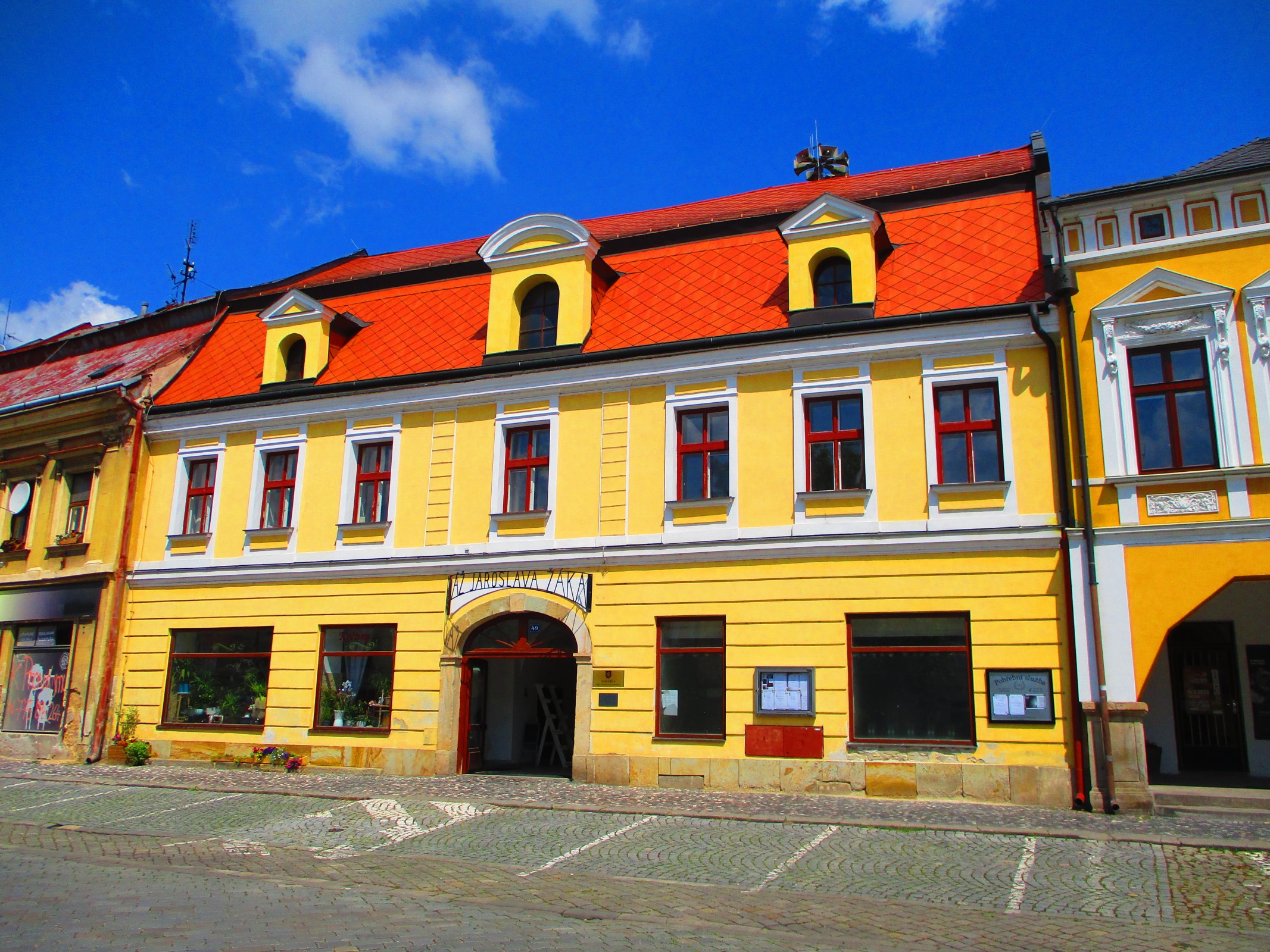 https://www.odumdal.cz/projekt/pasaz-jaroslava-zaka-v-jaromeri/. Díky rekonstrukci vnitřních prostor pasáže s bustou Jaroslava Žáka od sochaře Petra Nováka z Jaroměře firmou STAKO z Hradce Králové přesídlil na náměstí finanční úřad. Dále zde byla umístěna kancelář notářky Mgr. Lubislavy Randusové, kavárna Žákova Studovna, prodejna květin a nové veřejné toalety, které nahradily nevyhovující WC u Komenského mostu. Roku 2015 byl také dostavěn výtah. V letech 2018-2019 proběhla rekonstrukce 2 spodních podlaží, kam se v roce 2020 přestěhoval odbor dopravy a silničního hospodářství. Téhož roku byla provedena rekonstrukce obchodů v domě. Více informací o domě lze získat na webu památkářů: