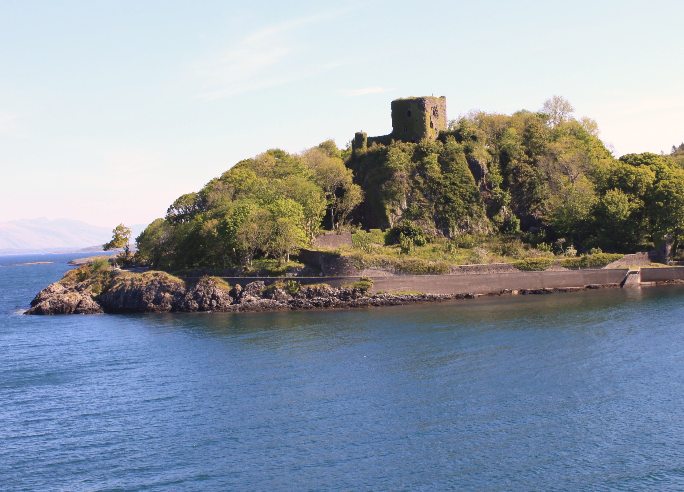 Hrad Dunollie stojí u zálivu při odjezdu lodí z Obanu na místě s výhledem na hlavní vjezd do zátoky. Byl opevněn od 7. století. Do fotogalerie jsou umístěny pohledy na tento hrad z různých míst a lodí, při našich cestách na ostrovy Coll a Mull. Je k němu pěkná procházka z Obanu kolem majáku a Památníku.