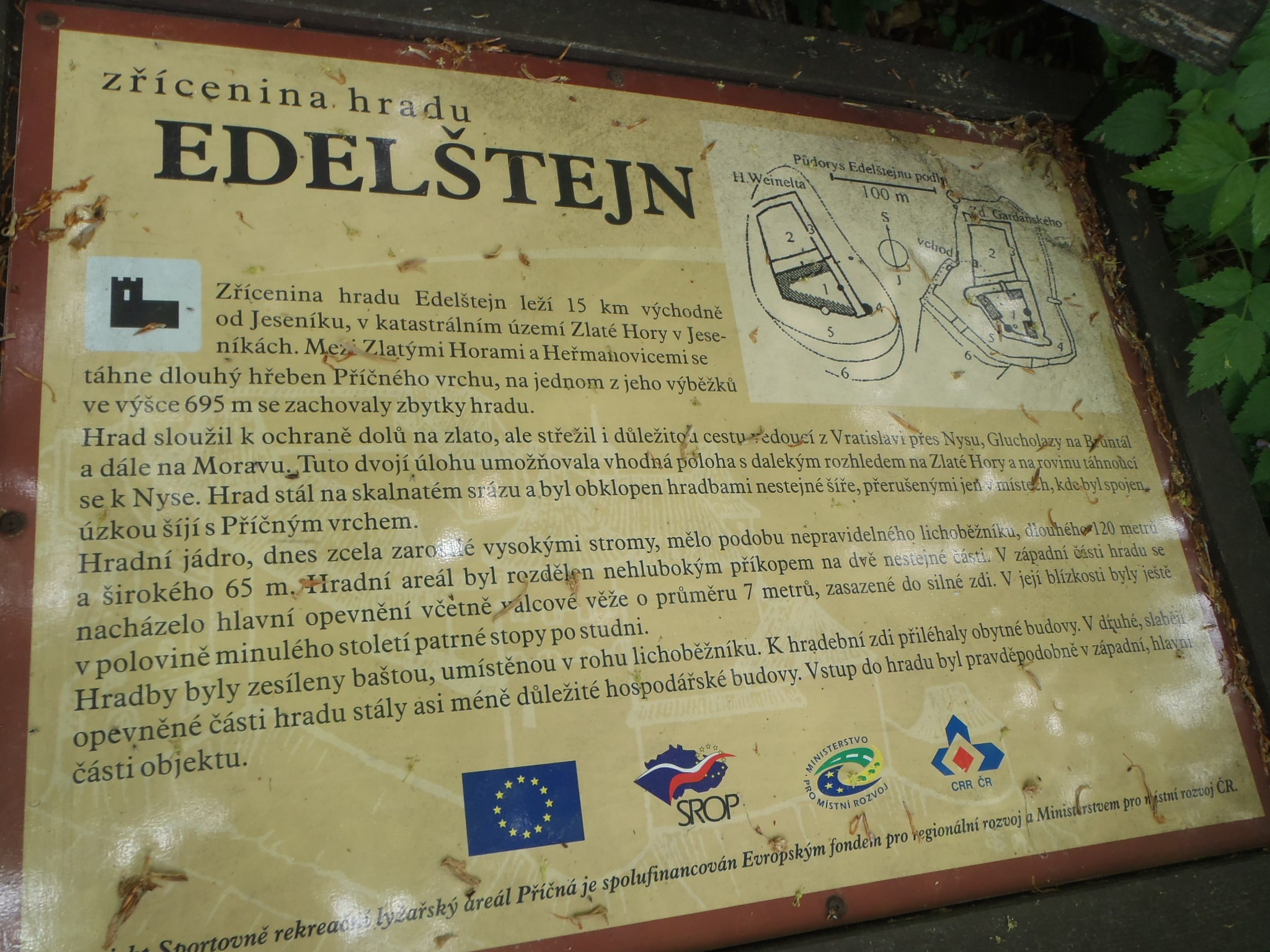 Zbytky zříceniny Edelštejn se nacházejí nad Zlatými Horami na severním výběžku Příčného vrchu. Vedou sem turistické značky ze Zlatých Hor a Rejvízu, ale v hustém lese občas zabloudíte.