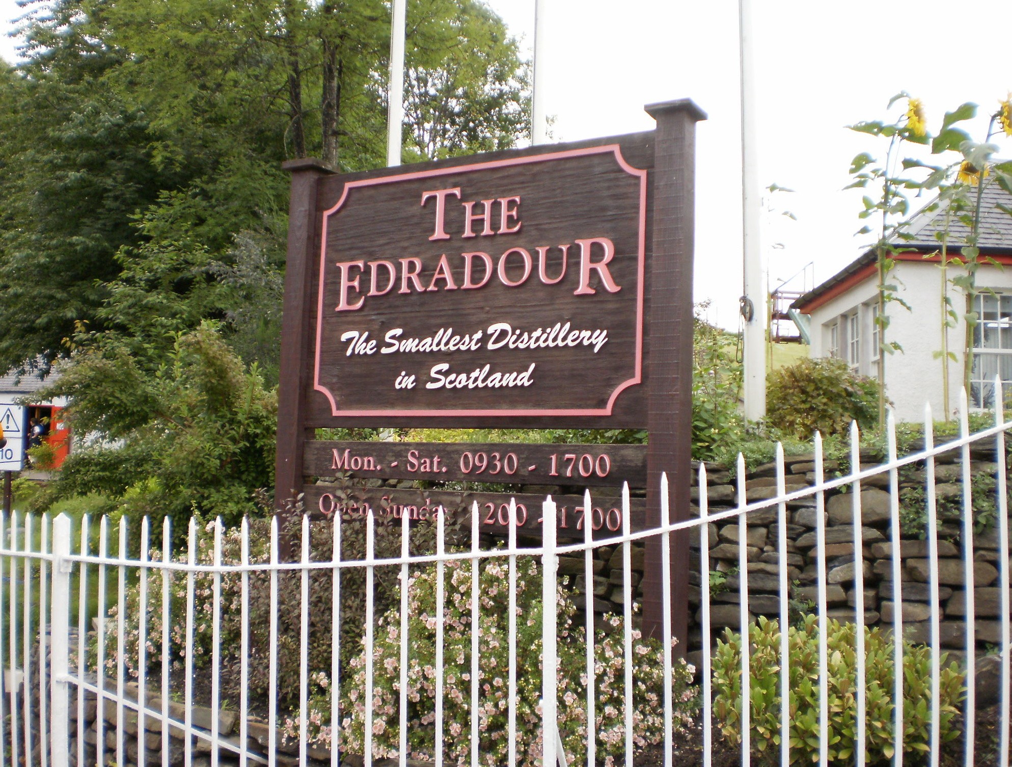 V oblasti Highland Perthshire u Pitlochry v Edradouru se nachází palírna whisky, nejmenší ve Skotsku a unikátní tím, že se vše dělá ručně, jako za starých časů. Založena byla v r. 1825 a stále si zachovává původní výrobu whisky se svéráznou chutí. Je známo, že whisky má léčivé účinky a říká se jí také voda života. Všude ve Skotsku se dříve pálila nelegálně, proto místní zemědělci, aby pálení whisky zlegalizovali, založili družstvo. Whisky je vyráběna v původních budovách a ručně v tradičních měděných přístrojích, které mají vliv na její chuť. Účastnili jsme se unikátního výrobního procesu slučování ječmene, čisté pramenité vody a droždí. Nejen že vše vidíme, ale i cítíme, což na fotografiích nelze zachytit. Voda se bere z původní studny, je vedena kolem domu a za tu dlouhou dobu se nic nezměnilo. Ochlazování se provádí pouze studenou vodou, whisky zraje v dubových sudech po mnoho let. Po prohlídce výrobního procesu jdeme do místnosti, kde je nám promítán film a ochutnáváme při tom whisky. Konečná fáze návštěvy je pak pochopitelně nákup v přilehlém obchůdku, kde nás obsluhují kromě děvčat i Skoti v kiltu. Venku je vše hezky upraveno se spoustou květů.