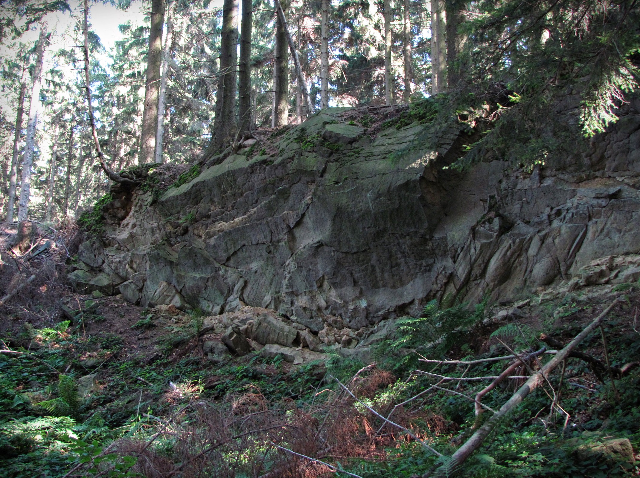 Vizovické vrchy jsou součástí flyšového pásma vnějších západních Karpat, a tak jako třeba v sousedních Hostýnsko-Vsetínských vrších, i tady se pod příkrovem lesa skrývá množství skalních výchozů. Většinou se jedná o skalní útvary drobnější a neznámé, které do věhlasu takových Čertových skal u Lidečka či skal nad Lačnovem asi nikdy nedorostou, nicméně i setkání s nimi se může stát setkáním zajímavým. Samozřejmě za předpokladu, že se nebudete kvůli takovému drobnějšímu výchozu trmácet po zdejších proklatě Ostrých svazích cestou necestou, ale budou vám naservírovány hezky pod čumáček. Dobře přístupna je vrcholová skalka Klášťova - Čertův kámen, neboť kolem ní vede značená turistická cesta, ale stejně dobře dostupné je místo, vzdálené vzdušnou trasou asi 0.5 km na severozápad od tohoto magického vrchu. Směrem k jihu se tu přímo nad rozcestím modré a zelené tur.trasy ve vrcholovém úbočí bezejmenného vrchu na vás zašklebí 50 m dlouhá jizva zaniklého lomu na pískovec. Pokud se vyšplháme na jeho okraj, zaujmou nás směrem k jihu zbylé pískovcové skalní stěny. Nejsou sice ani čtyři metry vysoké, ale o to jsou delší... a na defilé té největší z nich můžeme pozorovat - (jak v učebnici geologie), velmi zajímavý průřez luhačovickými vrstvami zlínského souvrství z období eocénu. Po zkušenostech z Vysokého Pole, kde byste na místě skládky našli stopy po vytěženém pískovcovém lomu na kámen, který se dobře v deskách "štípal" na základy hospodářských budov a na dláždění dvorků, předpokládám, že tento lom pro změnu sloužil zase obyvatelům dědiny Bratřejov, vzdálené od místa jen asi 2 km právě po té zelené tur.trase...