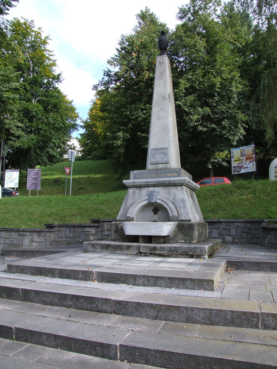 Francouzský pomník nademe při vjezdu do Lázní Jeseník na ulici Priessnitzova u parkoviště před samoobsluhou. Na tomto místě ovšem nestál vždy. V době svého vzniku na konci první poloviny 19. století - přesněji v roce 1841 - byl postaven u lázeňského domu „ Zur Genie-Quelle“ majitele Antona Grögera nalevo od cesty vedoucí z lázní do centra Jeseníku. Protože však pramen Genie Quelle, na kterém byl pomník postaven, začal po první světové válce vysychat, tak byl pomník přenesen na dnešní místo na jiný pramen, tentokrát nazvaný Francouzský. Původní pomník nechal v roce 1841 postavit plukovník francouzské armády rytíř M. de Plaremberg - je však možné, že podle podpisu na smlouvě je správné jméno Blaramberg.