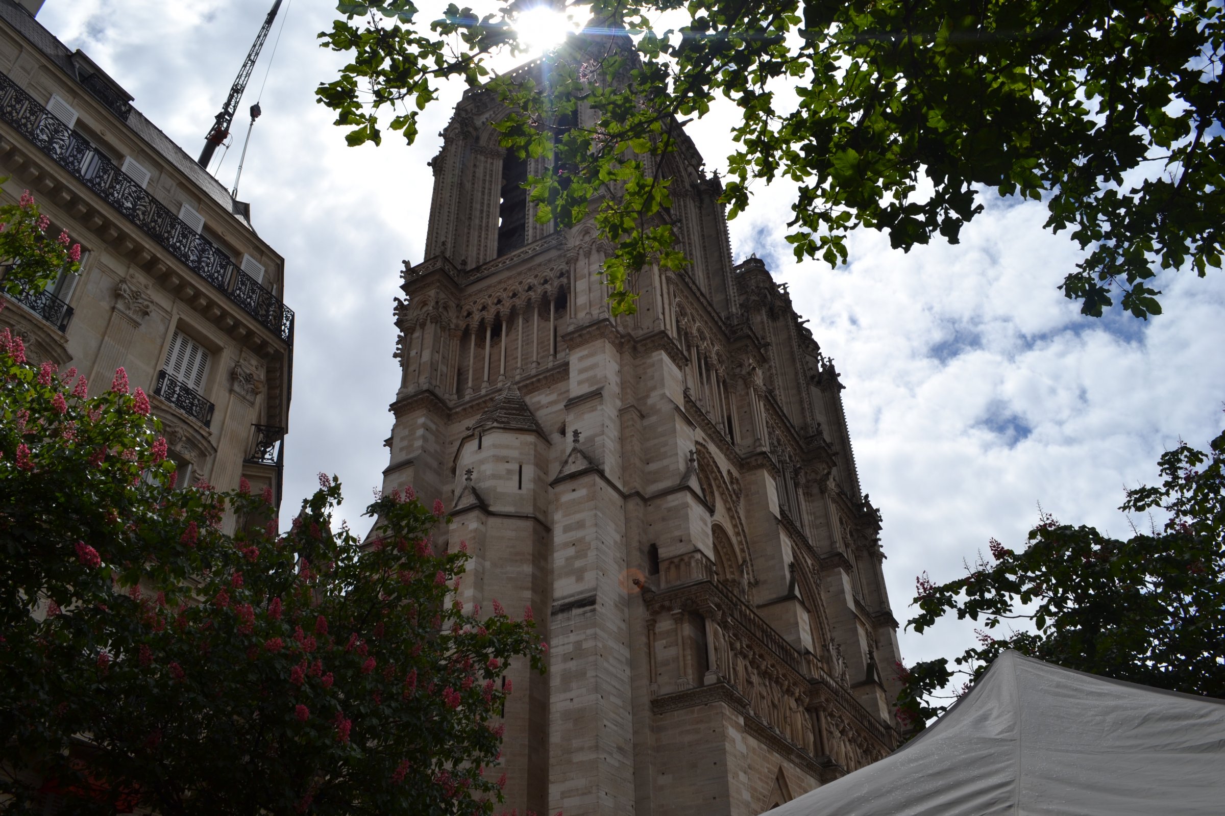 Najskôr sme prišli k jej hlavnému vchodu k západnej fasáde. Tu sme toho moc nevideli, nakoľko katedrála bolo ohradená zábranami a strážená políciou. Pokračovali sme uličkou okolo katerdály. Tu sme z jednej malej uličky videli časť, ktorá horela. Pokračovali sme ďalej až sme sa dostali k jej zadnej časti, kde zhorela hlavná veža a strecha. Vrch katedrály bol pokrytý fóliou, aby sa dovnútra nedostala voda. Myslela som si, že už väčšiu časť katedrály ani neuvidíme, ale našťastie sme pokračovali cez most a už odtiaľ sme videli väčšiu časť katedrály. Idúc po nábreží Seiny sa nám postupne ukázal Noter Dame po celej svojej dĺžke.