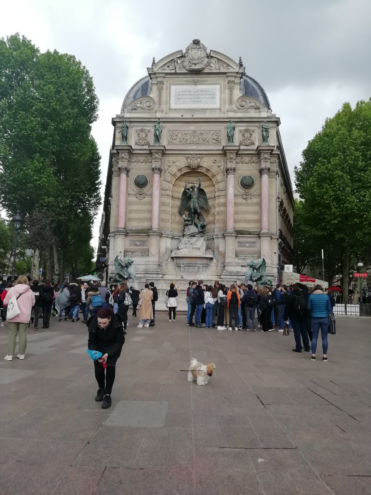 Ide o Fontánu Saint-Michel, ktorá dominuje rovnomenného námestiu. Kašna vznikla po prestavbe mesta za vlády Napoleona III. Pôvodne tu mala stáť mohutná socha Napoleona I., ale na naliehanie mestskej komisie nakoniec dostala prednosť fontána. S jej výstavbou začali v júni 1858 a slávnostne bola otvorená 15. augusta 1860.