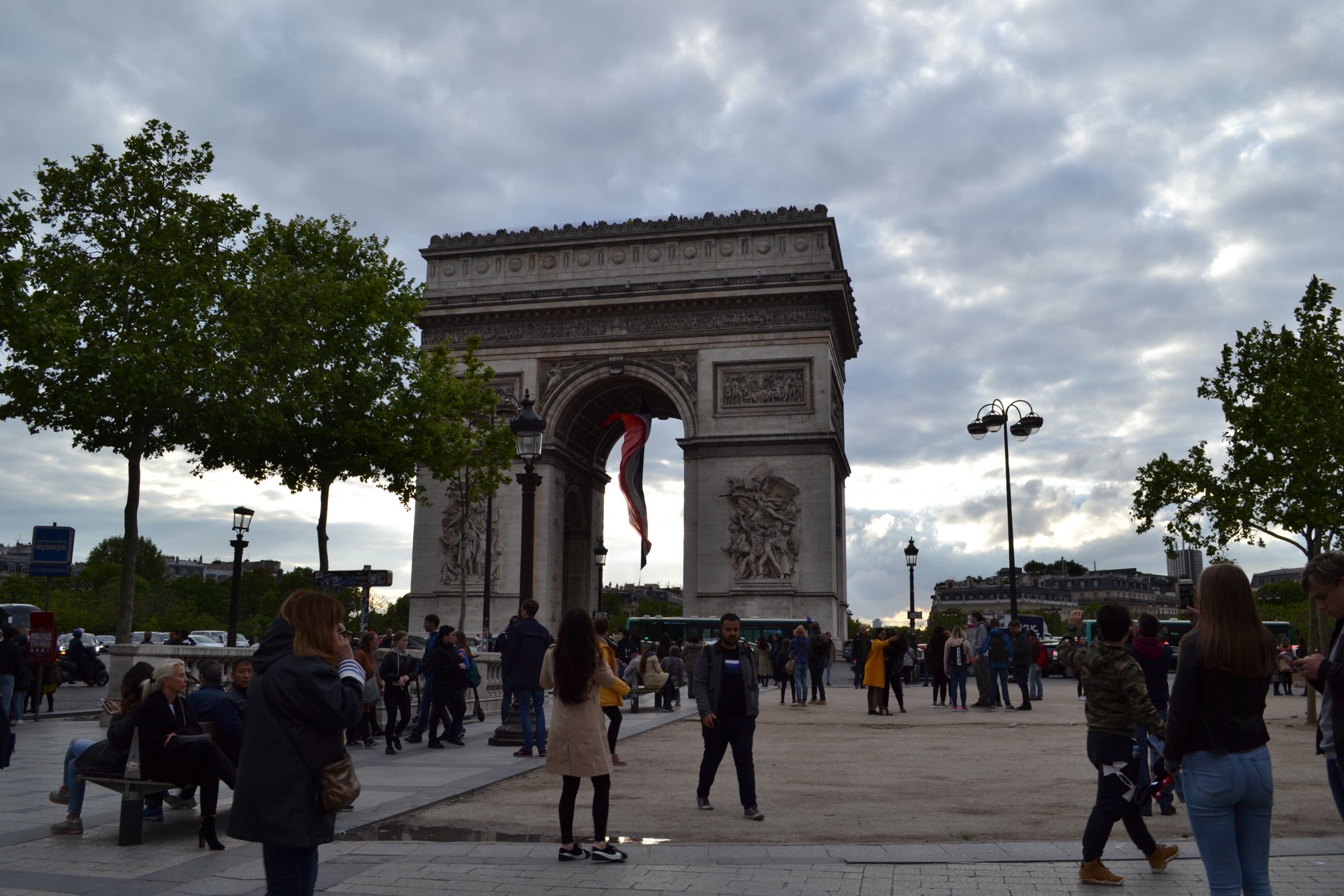 Veľký víťazný oblúk leží na Place Charles de Gaulle ( Námestí de Gaulla ), odkiaľ vychádza až dvanásť ulíc. My sme sa sem dostali po tej najznámejšej ulici - Champs-Élysées. O tom že námestie je križovatkou veľkého počtu ulíc svedčí aj veľký počet aut a ľudí, ktoré tu premávajú. My sme pri Víťaznom oblúku počas našej návštevy boli dva krát, ale vždy to bolo len na malú chvíľku. Prvý krát sme pred Veľkým oblúkom mali zraz po malej prestávke na občerstvenie, lebo nás čakalo ešte vyvrcholenie prvého dňa - návšteva Eiffelovej veže a druhý krát sme okolo prechádzali len autobusom. Prvý krát vo Víťaznom oblúku viala obrovská francúzska vlajka ale po dvoch dňoch tu už nebola. S vlajkou vyzeral oblúk majestátnejšie. Vlajka tu visela pravdepodobne na počesť osláv víťazstva nad Nemeckom v II. svetovej vojne.