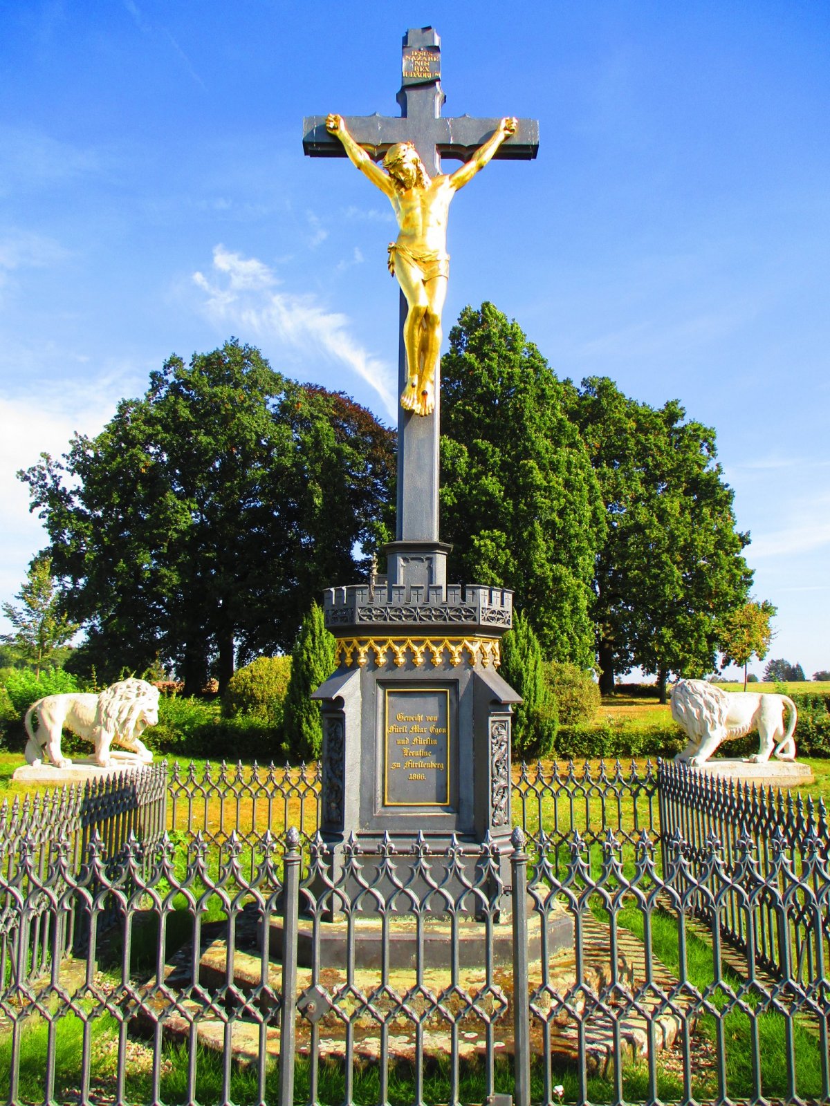 Všeobecně se tvrdí, že ke slavnostnímu odhalení tohoto kříže došlo 17. prosince 1866, ale toto tvrzení není tak úplně pravdivé, neboť kříž zde byl tehdy pouze umístěn a na posvěcení si musel počkat na příhodnější dobu. O jeho zřízování vyšlo několik krátkých noticek v „Národních listech“, a to - 8. prosince 1866: „Na bojišti králohradeckém a sice zrovna na Chlumu hodlá kn. Max. Egon Fürstenberg dáti postaviti veliký kříž z litiny s pozlacenou podobou Krista. Kříž se již lije v knížecí slevárně v Novém Jáchymově; je bez podstavce 18 stop vysoký a váží 4450 liber.“; 23. prosince 1866: „Na bojišti králohradeckém a sice na samém Chlumu postaven těchto dnův velký kříž z litiny jejž věnoval kn. Max Egon Fürstenberg památce padlých tam vojínův rakouských.“