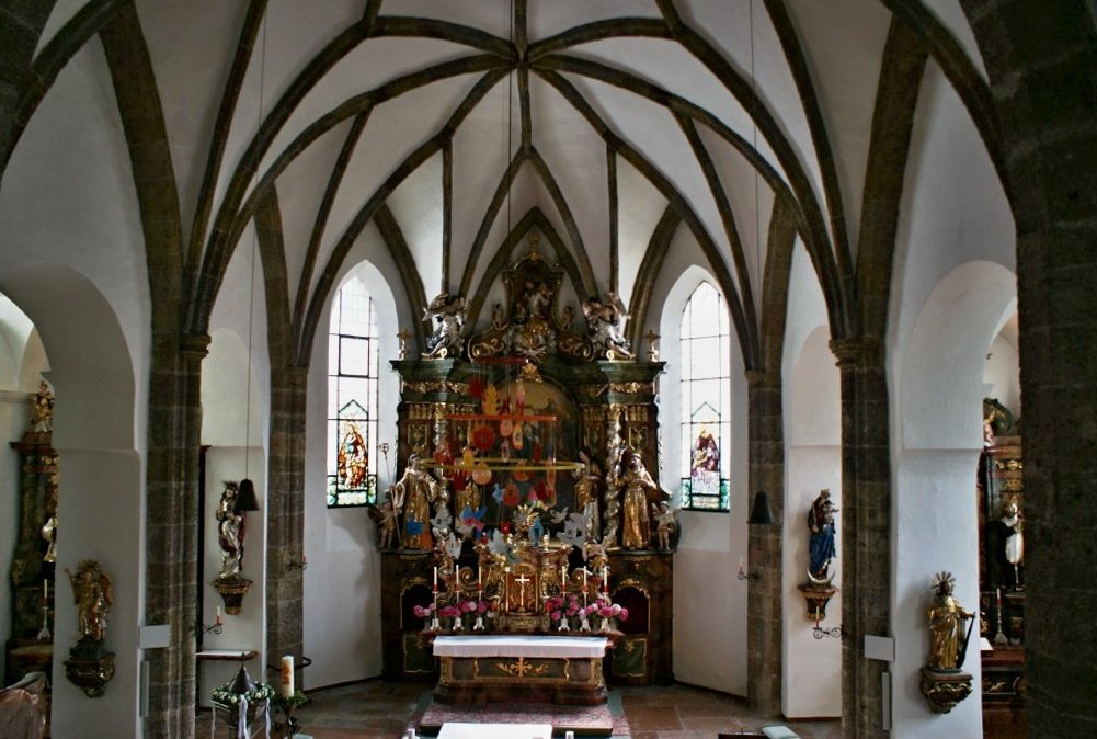 Interiér kostela bývá většinou přístupný pouze v období bohoslužeb, které se zde konají každou neděli v 9,15 hod. V sobotu probíhají mše buď v 19,00 hod. (léto) nebo v 17,00 hod. (zima). Díky tomu pak můžeme vidět zajímavý hlavní oltář z roku 1707, který zdobí obraz Korunovace Panny Marie se svatými Jany, Pavlem a Josefem. Ten v roce 1859 namaloval Josef Rattensberger. Interiérová podoba tohoto kostela je vůbec dost zajímavá. Pokud můžeme věřit odborníkům a rakouským informačním pramenům, tak vlastně kostel získal v roce 1688 podobu jednolodního halového kostela, který byl až o rok později upraven salcburským stavitelem Casparem Zuccallim do podoby trojlodí. Hned poté byla dokončena přestavba věže a její výrazné zvýšení. Tehdy také kostel získal nové zvony. Roku 1888 byla věž vážně poškozena po zásahu bleskem a její současná podoba tak pochází z roku 1890.