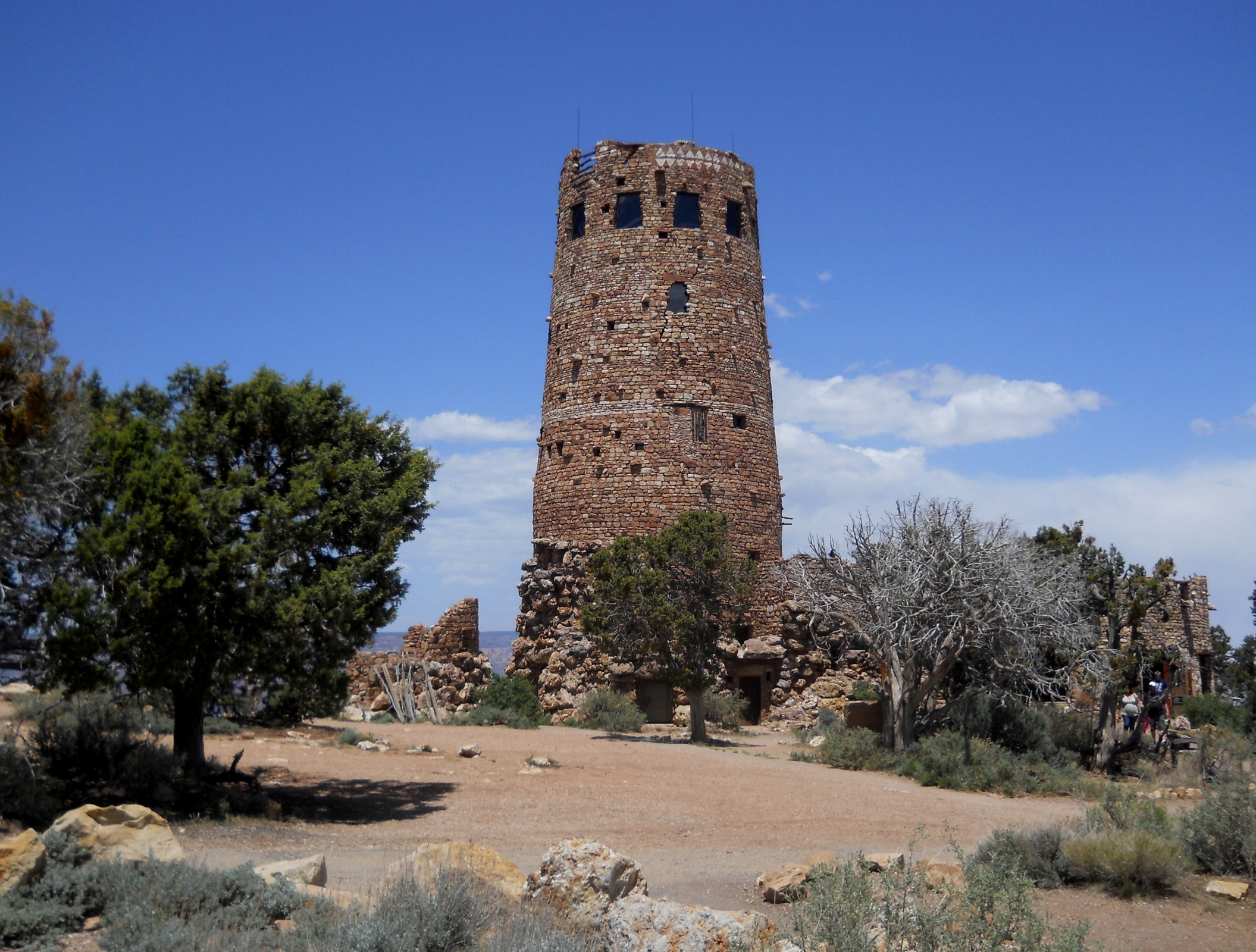 Parkujeme o kousek dál a jdeme se podívat na vyhlídku - na kamennou stavbu – že by to byla rozhledna? I tak se to nechá říct. Je to čtyřpodlažní stavba, dokončená v roce 1932. Byla navržena tak, aby se podobala starým věžím v indiánských pueblech. Věž je vyzdobena freskami, které jsou napodobeninou dřívějších maleb. V dolním patře je obchod s dárkovými předměty, horní podlaží slouží jako vyhlídkové plošiny, ze kterých je vidět východní část Grand Canyonu. Věž je také součástí Národního registru historických míst. Prohlédli jsme si stavbu, samozřejmě se rozhlédli i po okolí. Kaňon byl v lehkém mlžném oparu, ale přesto byla poměrně slušná viditelnost a zajímavé pohledy do kaňonu. Jeden žasne, co příroda dokáže.
