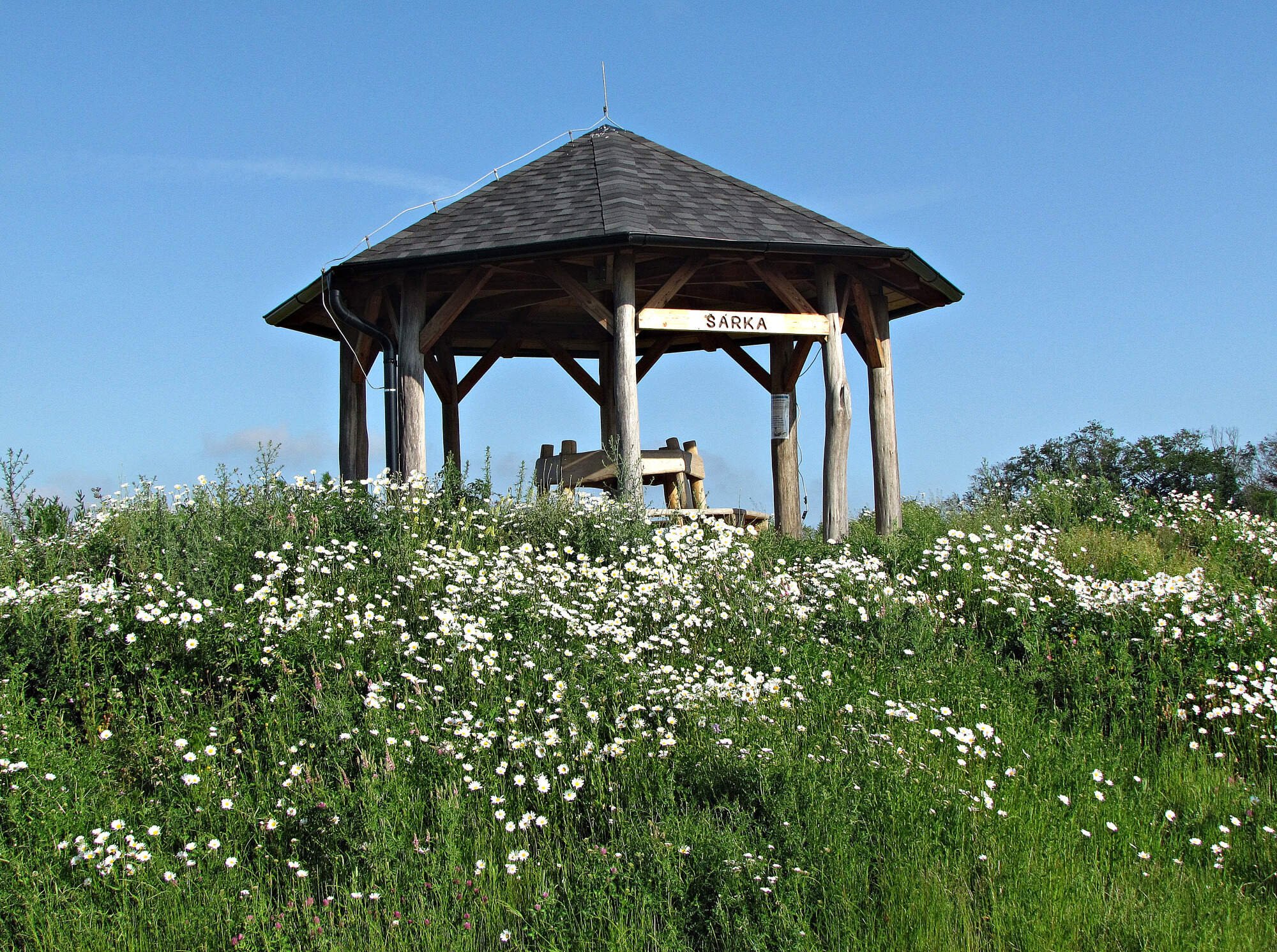 V nadm.výši 367 m se tady hned vedle silničky tyčí z uměle nasypaného návrší odpočinkový a vyhlídkový dřevěný altánek, který nese jméno Šárka. (Jestli je tak pojmenován po té potvoře, která vyšplouchla Ctirada anebo po děvě úplně jiné, tak to nevím.)
