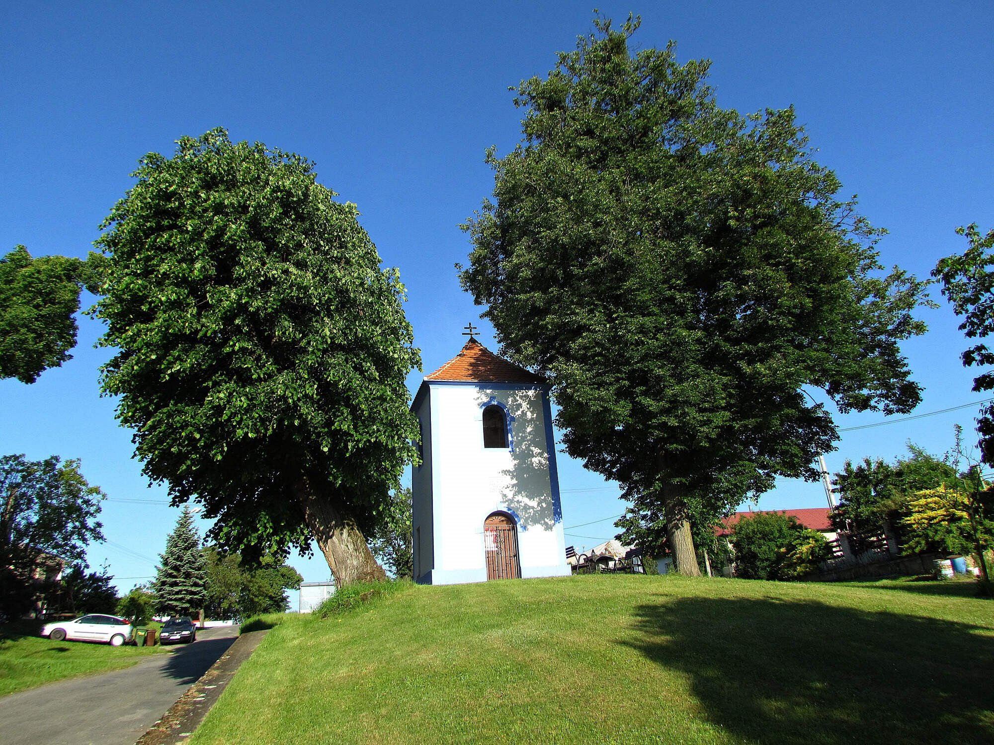 Velmi pěkná sakrální stavbička s modrobílou fasádou a obklopená dvěma lípami, z nichž jedna roste šikmo, se vypíná poblíž točny busu z návrší na jižním konci obce.