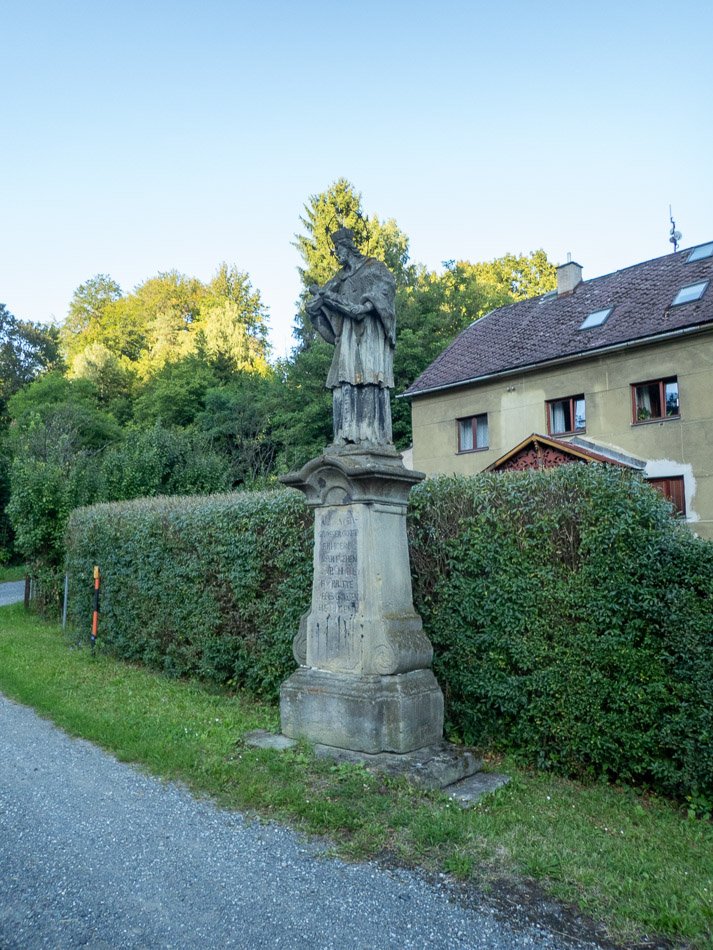 Zmíněná socha svatého Janka je pojatá v tradičním duchu. Na nízkém základu spočívá obdélníkový podstavec s ustupujícími rohy. Ustupující horní část podstavce nese zužující se sloupek s volutovými křídly. Nad ním je čelně prohnutá římsa s vrcholovou skulpturou. Svatý Jan v mírně pootočené poloze směrem doprava nese v rukou kříž s Kristem. Je oděn ve zdobeném kněžském rouchu, s biretem na hlavě, kterou obkružuje svatozář s pěti hvězdami.
