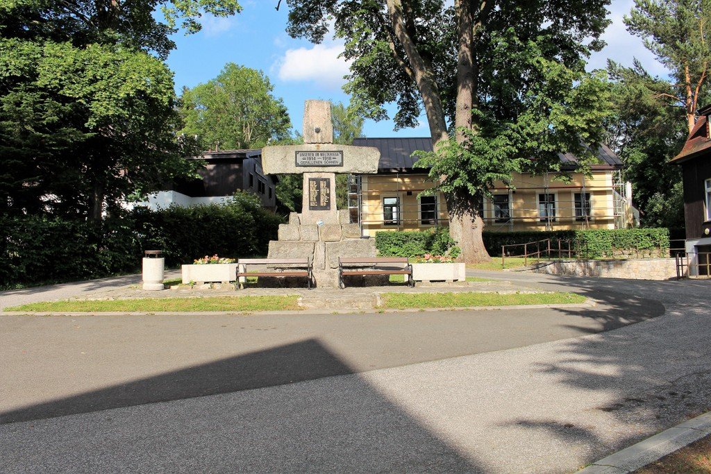 Harrachovský pomník padlým ve světové válce se nachází u hlavní ulice, nedaleko budovy městského úřadu. Stojí na malém prostranství, na menší travnaté ploše. Před pomníkem je položená dlažba. Samotný pomník má v základovém podstavci velké kamenné kvádry. Na nich je položena řada menších opracovaných kamenů. Nad ní se vypíná kamenný kříž složený ze tří částí. Na středu kříže a po jeho stranách jsou tabulky se jmény padlých, kterých je 69. V horní části kříže je německý nápis. Před pomníkem jsou dvě lavičky a větší nádoby s květinami. Ve kterém roce po 1. světové válce byl pomník postaven, jsem se nedozvěděl. Známé je ale datum jeho opravy. Ta proběhla v roce 2006 a stála 799 000,- Kč. Z toho plyne, že pomník nebyl v dobrém stavu a možná byl po 2. světové válce poškozen. Ničení válečných pomníků v Sudetech bylo dosti běžné. V prostoru nad pomníkem roste nádherná stará lípa. Jedná se o hezky upravené místo.