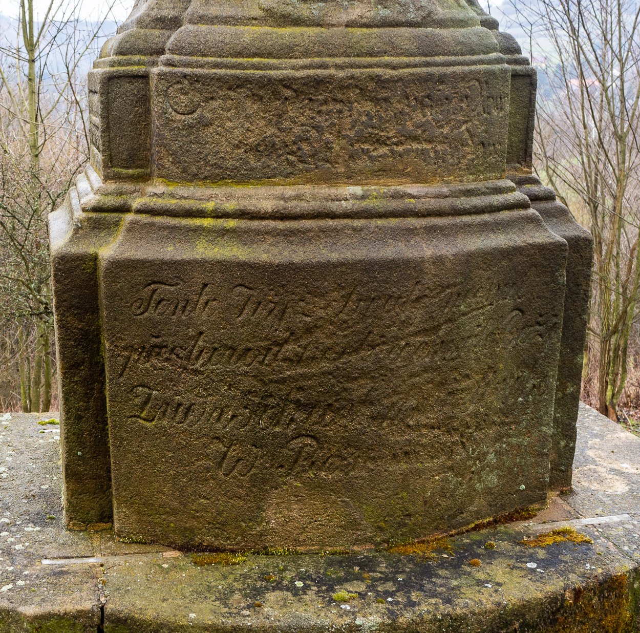 Na čelní straně vypouklého podstavce je jen z části čitelný český nápis, kde se dozvíme, že kříž je postaven patrně ke slávě Boží. Na zadní straně se dá odhalit část datace 18...8 a snad i jméno kameníka?