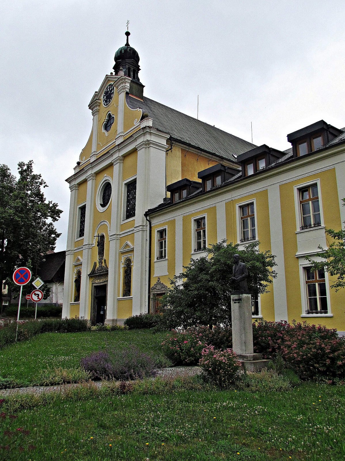 U průsečíku ulic B.Kobzinové a ulice P.F.Ledvinky se na horním konci historického jádra města nachází hned několik zajímavých kulturních památek. O Štáflově chalupě, sloupu se sv.Janem Křtitelem a funkcionalistickém stavení Husova sboru už jsem se tady v článcích zmínil, vše viděné je ale třeba doplnit popisem objektu nejdominantnějšího. Je jím chrám Sv.Rodiny těsně sousedící s budovou bývalého kláštera, zbudovaného bosými augunistiány za bývalými městskými hradbami. Ti zde nejprve měli jakési provizórium v podobě dřevěné kaple, tu ale nedlouho po třicetileté válce v rámci rekatolizace (Německý Brod v té době totiž obývali hlavně protestanti) nahradil monumentální barokní konventní chrám.