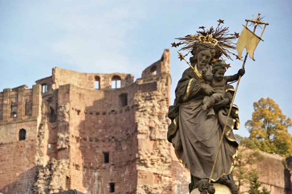 Stošedesátitisícové německé univerzitní město Heidelberg nabízí svým návštěvníkům velké množství historických památek. A to i památek občas docela neobvyklých. Jednou z takových je také kašna Panny Marie na náměstí Kornmarkt, respektive vrcholová fontánová socha.