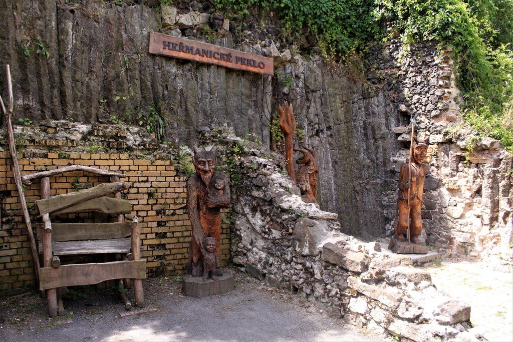 Obec Heřmanice najdeme ve frýdlantském výběžku v údolí říčky Olešky. Je tady i silniční přechod do Polska, několik zajímavých podstávkových domů a také peklo. Místní peklo se nachází na levém břehu výše jmenované říčky, na východní straně vsi. Stačí přejít můstek a vydat se k turistickému přístřešku. Na prostranství před přístřeškem je loď a pod nedalekou menší čedičovou skálou je vstup do pekla. Začíná seznámení s pekelnými bytostmi, kterých tady je osm. Jsou tu i medvídci s mámou medvědicí, hezky vyřezávaná lavička a trůn pro vládce pekla. Teplota je skoro pekelná a do 30° C chybí jediný stupeň. Tedy peklo jak má být. Štěstím pro návštěvníka je, že sochy jsou dřevěné a rádi se seznamují. Dozvědět se o tvůrcích soch zůstalo pro mě tajemstvím. Údajně se sochami se tady začínalo již v roce 2008 a k slavnostnímu otevření pekla došlo 9. prosince 2017. Hezké místo, které pohladí a vrátí do dětství. Že se sochy povedly, dokáží přiložené fotky. Parkovat je možné na opačném břehu řeky.