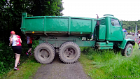 Od občerstvovačky cesta po asfaltce netrvá dlouho a odbočujeme doleva na lesní cestu. Zhruba ve 40 minutě od startu vidím po své levici pneumatiky. Pro borce je zde připravena další zkouška, spíš zábavná než těžká. Nedá mi to a ač se jedná o „čistý“ běh, tak si přemístění pneumatik barborou na určitou vzdálenost nemohu nechat ujít. Nejde mi až tak o čas, navíc zde na skoro úplném chvostu závodního pole. Jde mi ale strašně moc o zábavu a zážitek. Prostě si chci závod jak to jen jde maximálně vychutnat. Za pár minut pokračuji dále a snažím se doběhnout ty co mě předběhli nyní, když jsem „si hrál“. Za tři možná čtyři minuty dobíhám v klouzavém bahnitém terénu, ale o to zábavnějším (dokud se nepřistane na čumáku nebo zadku) běžce a běžkyně, kteří mají o trochu méně odvahy než já. I tak je má rychlost o dost větší než by měla být, ale potupnému držkopádu se mi podaří vyhnout a udržet si svou čest. Z lesní cestičky, která by se spíš dala nazvat bahnitou skluzavkou se dostávám hodinu od startu k dalšímu testu a to jsou shyby. Na konstrukci se mi daří lehce vyskočit, protože není až tak vysoká. Na druhou stranu, když se zavěsím, tak nohami na zem spolehlivě nedosáhnu. Daří se mi udělat jen jeden jediný shyb a ještě se mi jako naschvál (asi po tom výskoku) pustí do nohy křeč. Inu, je třeba seskočit a zapůsobit protisilou. To se daří a tak po chvíli mohu zase běžet. Skoro všichni běžci i běžkyně, které jsem v terénu „dal“, mě zde předbíhají. Po asfaltce z kopce se běží dobře, po křeči ani památka, super. Za čtyři minuty po posilovačce na ruce se dostávám k další zvládnutelné „překážce“ na posilování rukou i nohou a to je nošení pytlů písku do kopce. Už si nepamatuji přesně váhu, ale kolem dvaceti kilo určitě měly. Tohle zpestření nemohu vynechat, tím tuplem po zklamání z předešlých shybů. Nečiní mi větší potíže, jen to, že mě doběhne další běžec za mnou. Dáváme se do řeči a jako vždy je o čem mluvit. Jedná se o borce, který si vyzkoušel i ryzí závod (plnohodnotný s překážkami), ale nyní má jen běh. V kopci mám trochu navrch a tak se mu vzdaluji. Při kochání se bortící se hradní stěnou na kterou prostě musím vylézt, mě ale opět doběhne.