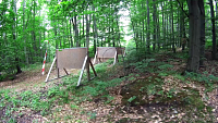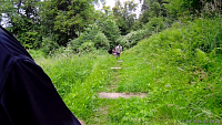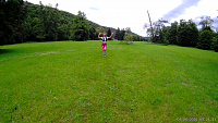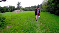 Po deseti minutách od startu, kdy držíme solidní tempo , se situace rychle změní. Já si běh nemohu nezpestřit ničím jiným než přebroděním řeky. Až z videa zjišťuji, že jsou ve vodě pneumatiky, ale co se s nimi mělo dělat netuším. Ještě nikdy jsem Moravici nebrodil a tak jsem vcelku zvědav a nervozita stoupá. Přitom se ale krásně chladím. Kdybych přesně tušil co mě bude čekat, tak si s sebou vezmu pořádný lavor vody, abych si ji mohl v nejtěžších okamžicích lít na sebe a neuvařil se. Probíhám nad baštou, které si skoro ani nevšimnu, jmenuje se Rondela. Zatím je stoupání ještě v klidu, ale to se změní. Za necelou čtvrthodinu od startu stoupáme historickými „Zámeckými schody“. V jejich závěrečné nejvyšší části se otevírá pohled do údolí, ale přece jen již dosti výrazně omezený zelení, nicméně i tak krásný. Díváme se ze západního úbočí táhlého kopce na kterém mnohem výš stojí hradecký zámek s Červenou a Bílou věží, Medvědí skálou a Bezručovou vyhlídkou. Do schodů my na chvostu již jen jdeme. Nicméně i schody jednou skončí a po chvíli se cesta mírní, narovnává a možná se mi zdá, že i trochu klesá. Z potupné chůze opět můžeme přejít alespoň v jakýsi pomalý běh. Špičkoví závodníci i průměrný střed závodního pole je kdo ví kde daleko před námi. Těmito místy jsem nikdy nešel, vlastně nikdy jsem nebyl dál než u Bílé a Červené věže zámku v Hradci nad Moravicí. Natož, abych zkoumal svahy. Za chvíli poznám, že to byla velká chyba a o mnoho jsem takto přišel. Zatím je cesta pohodová, ale to, co ze stoupání udělá jednu, možná i více poctivých překážek, teprve přijde. Pohled do údolí k řece Moravici je mnohem strmější než na videu vypadá. V zápalu boje proběhneme správnou odbočku do kopce a kdyby proti nám neběžela další skupinka, která se podobně zapomněla, tak asi běžíme zase zpátky do údolí po červené a žluté turistické značce až k čističce u Pilarky jen kousek od hlavní cesty vedoucí z Hradce do Žimrovic, Melče a dál… Naštěstí jsme se otočili a odbočku přece jen našli. Trochu jsme tím dohnali „poněkud rychlejší chvost“, ale prakticky hned za odbočkou začal kopec ukazovat svou sílu. Nesnažil jsem se nikoho předbíhat, bylo by to jen marněním sil. Správná odbočka je asi 70 metrů před křižovatkou připojující žlutou značku k té červené z kopce. Zajímavým zpestřením je patrně lovecká chata s červenými okenicemi. V pětadvacáté minutě od startu již nekompromisně stoupáme do kopce a jsme rádi, že jsme rádi. Padesát výškových metrů v délce zhruba 200 metrů nám trvá asi pět minut. Pak je již zasloužený odpočinek po cestě doprava která nestoupá. Ani to netrvá dlouho a dostaneme se na první občerstvovačku. Záminka na krátké zastavení, ale ne zas až tak dlouho, aby mě i ti poslední nepředběhli. Kudy přesně jsme běželi si moc nevybavuji, jen to, že k občerstvovačce to již bylo po asfaltce. Kousek před tím, než jsme se na ni připojili, jsme míjeli (já podlezl) Big Wall. Ani za boha by mě na ně nedostali, abych se na nich ještě nepřizabil.