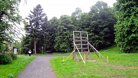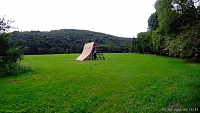Dostávám se dál k šílenosti „Vlnivec“ - Weaver. Je to jakýsi domeček z desek, který se překovává vlněním okolo nich. Jeden „trámek“ se překonává shora, následující zdola, další shora a tak až do konce. První z nich pochopitelně není až tak nízko jak bych si přál. Uznávám, že na první bych ani moc nevěděl jak vylézt a co potom, tak to už vůbec netuším. Přes louku se dostávám na opačnou stranu k cestě, která vede k Žimrovickému splavu. Zde je efektní překážka, které já osobně říkám „rampa“. Člověk se musí rychle rozběhnout a vyběhnout až nahoru nebo se alespoň chytnout horní hrany a přitáhnout. Je to ta překážka, která často bývá na konci závodu před cílovou rovinkou a je divácky nesmírně populární. Tato verze buď byla menší neboť i mě se vcelku dobře dařilo vyběhnout dost daleko a asi bych se nahoru dostat mohl. Ale kdo ví? Na překážku kterou jsem vždy považoval za „děsivost samu“ na druhý pohled nevypadá až tak nezvládnutelně. Po tréninku by to možná šlo. Následuje síť mezi stromy, která buď není ještě napnutá nebo nevím jak bych ji měl překonat.