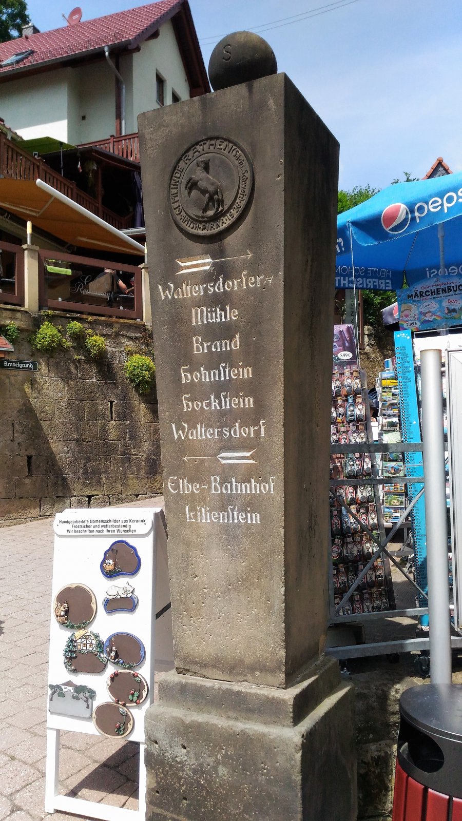 Mezi hradem Hohenstein a městečkem Rathen je jich několik. Jeden ukazatel stojí na křižovatce silnic u rodinného venkovského hostince Hocksteinschänke, druhý na turistickém rozcestí Lohmener Parkplatz u Bastei, další pak u odbočky na Bastei a do lesního divadla v Rathenu, největší a nejhezčí sloup stojí pak v centru městečka Rathen.