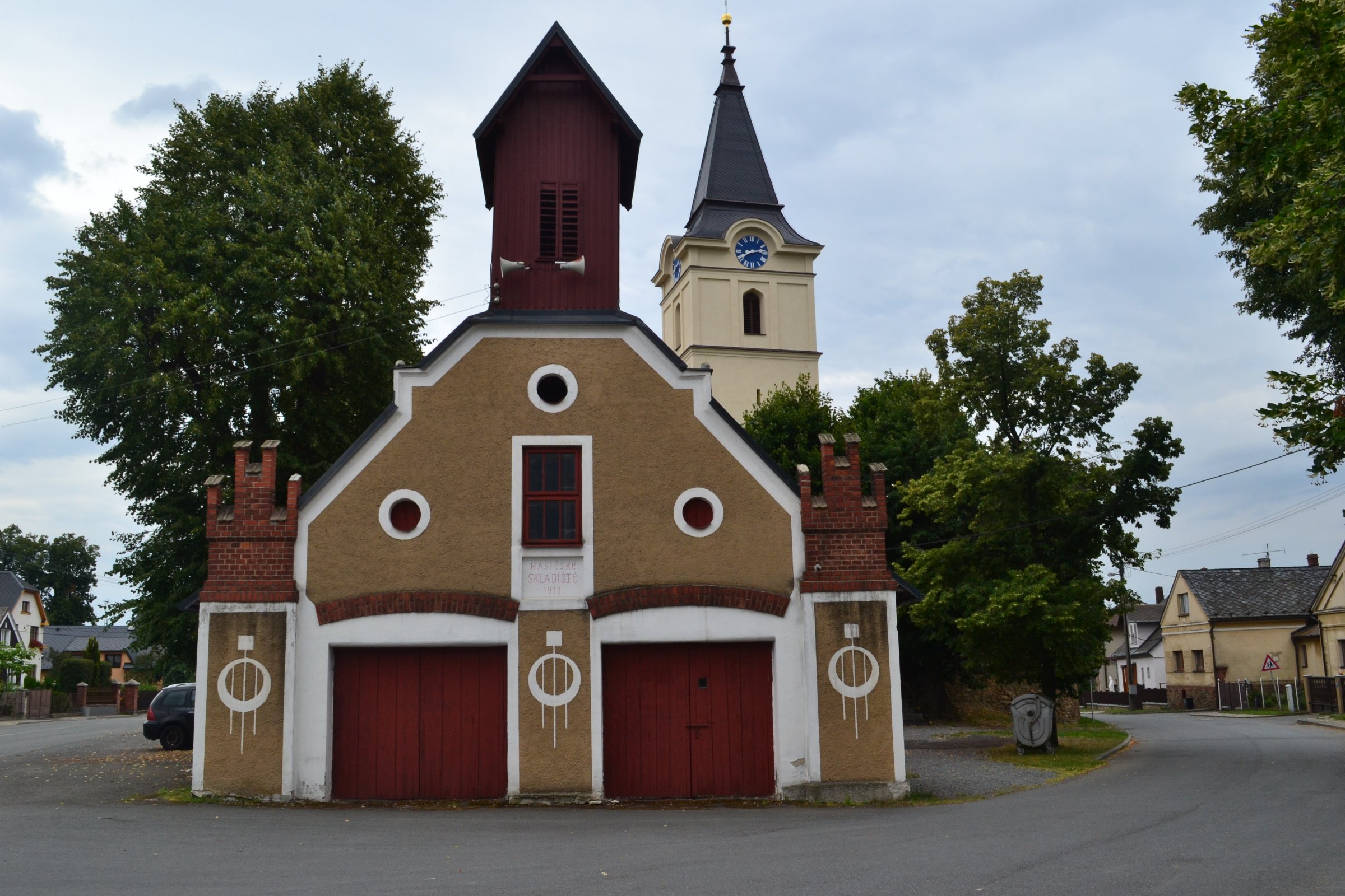 pohľad na vežu kostola a hasičskú zbrojnicu